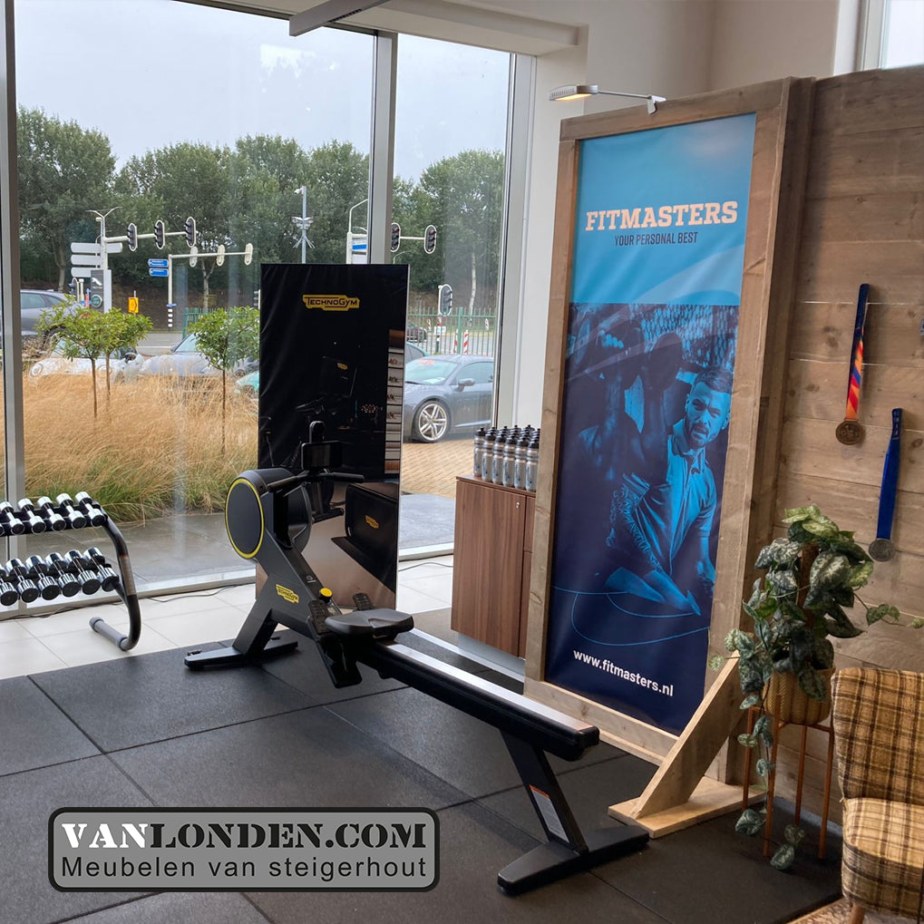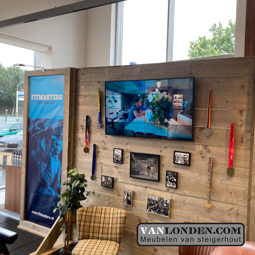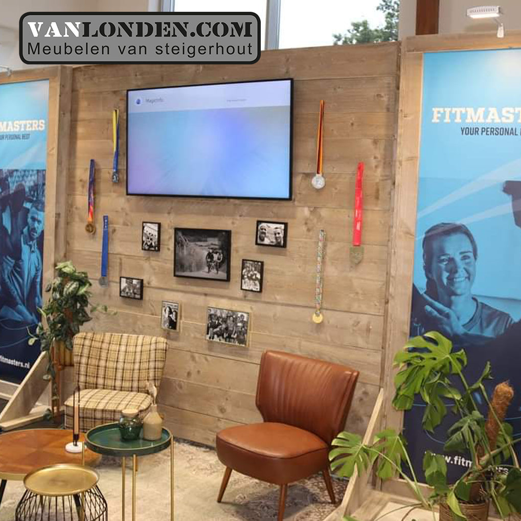 Voor Fitmasters in Breda heeft Vanlonden.com een mooie beurswand gemaakt. Een grote steigerhouten achterwand met 2 grote lijsten met visuals. Fitmasters