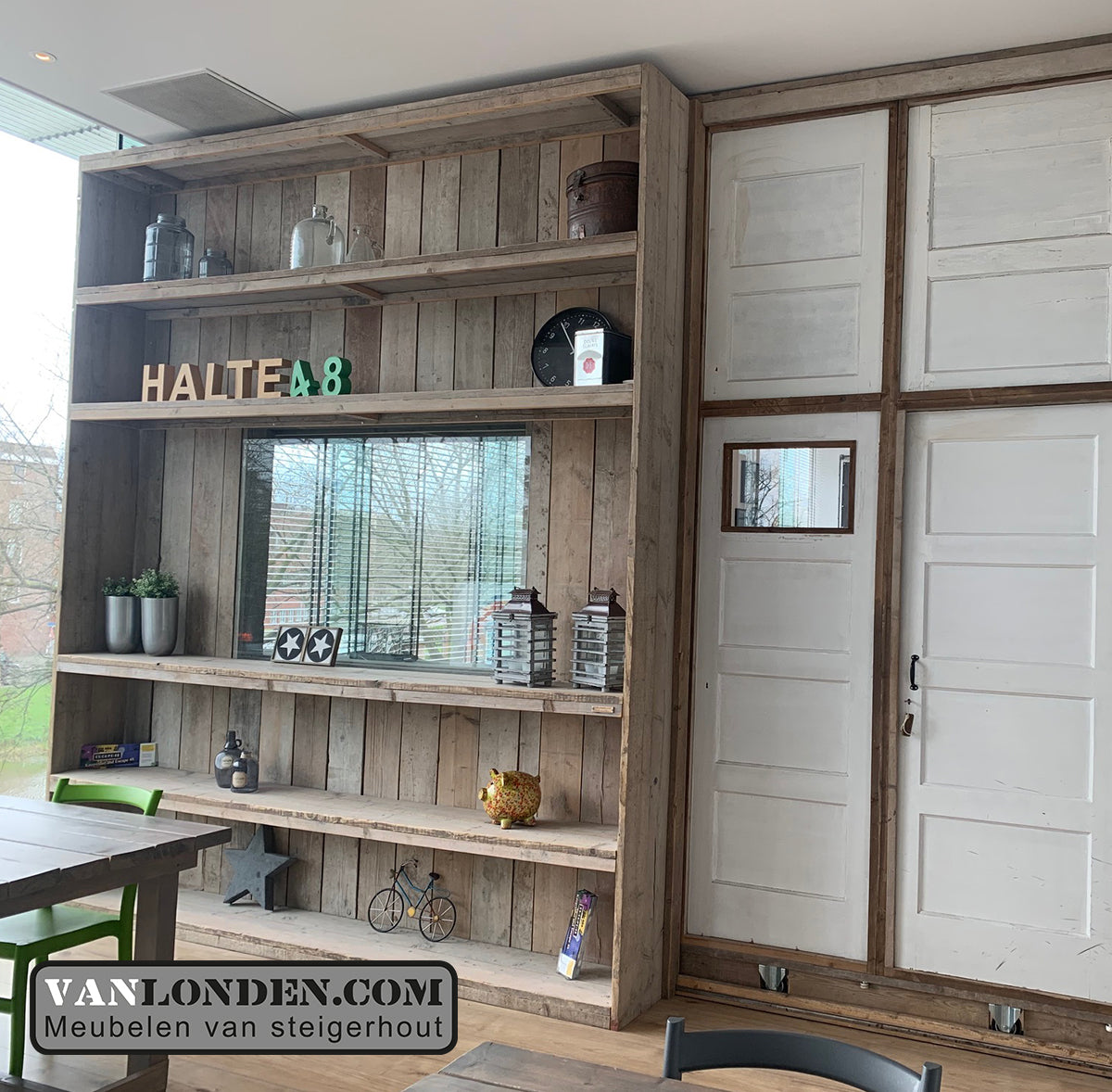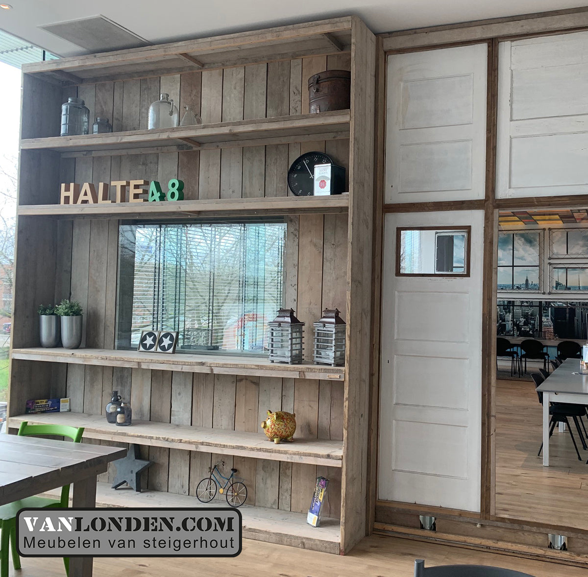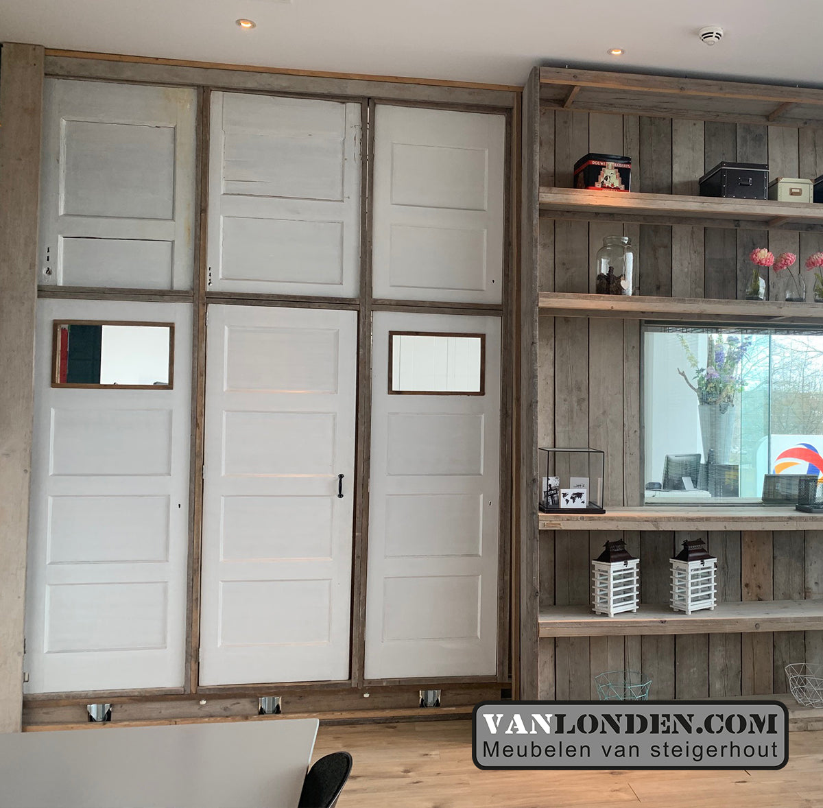 Grote ruimte vullende kast en grote schuifdeur met oude paneeldeuren bij Escaperoom Halte 48 in Breda, waar je moet je zien te ontsnappen door middel van puzzels, raadsel en spellen. En dat allemaal in 48 minuten.