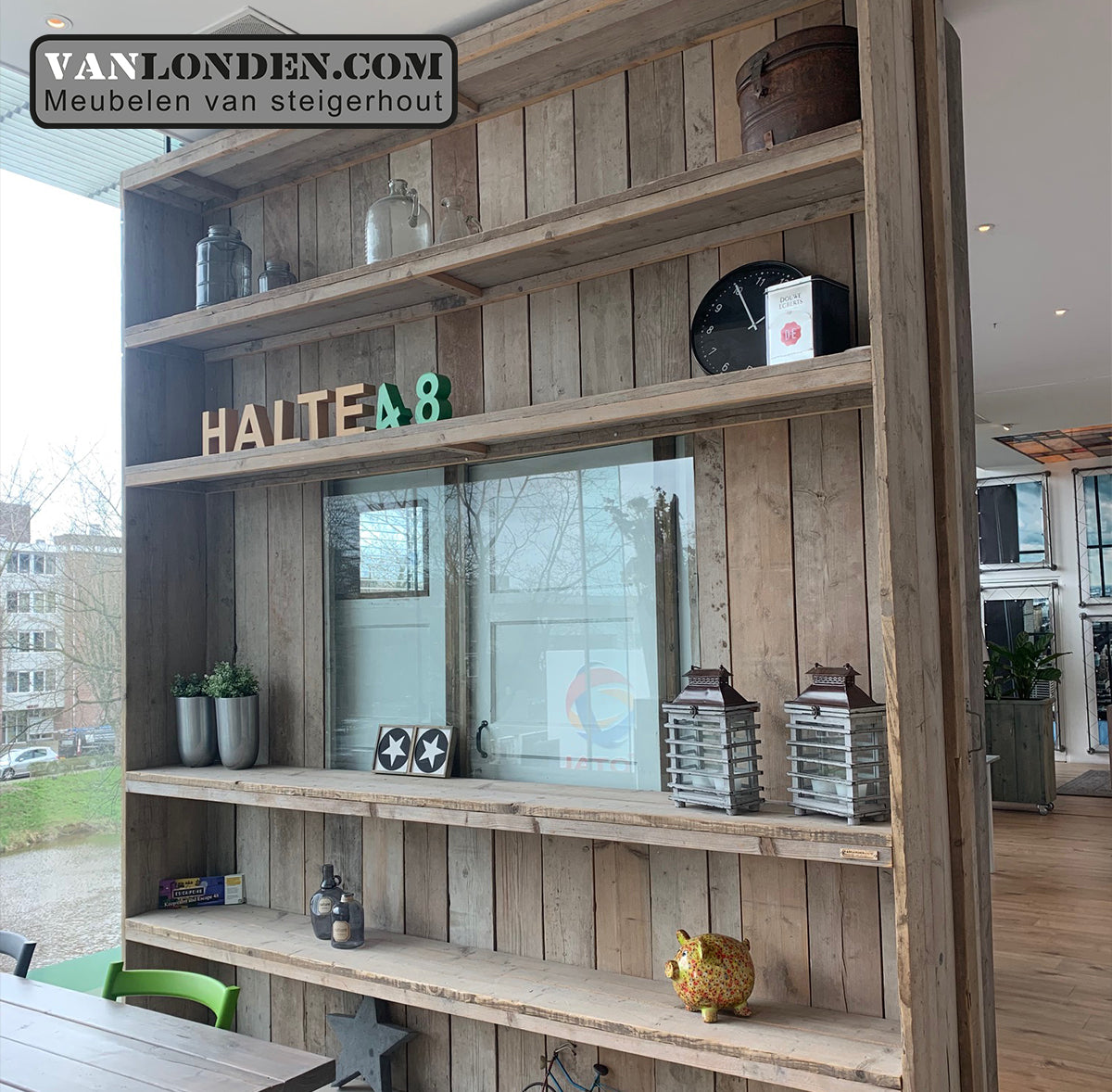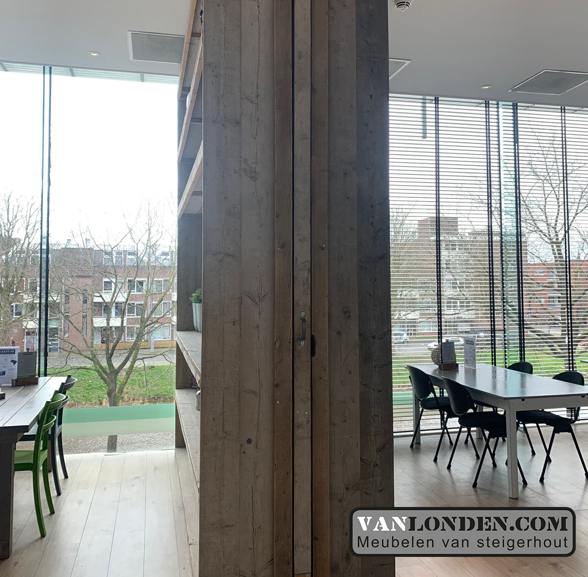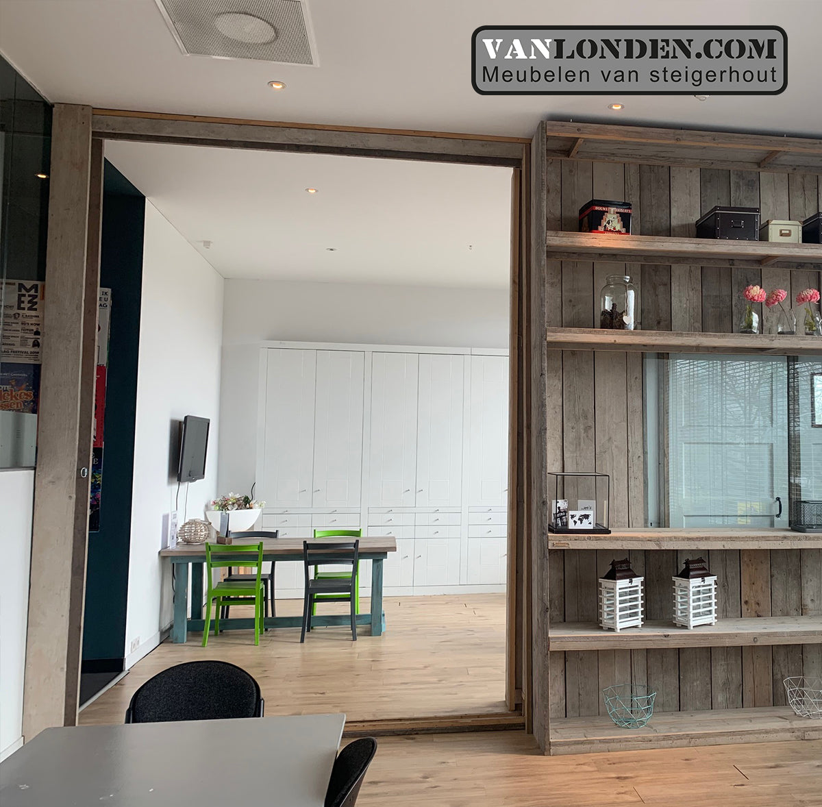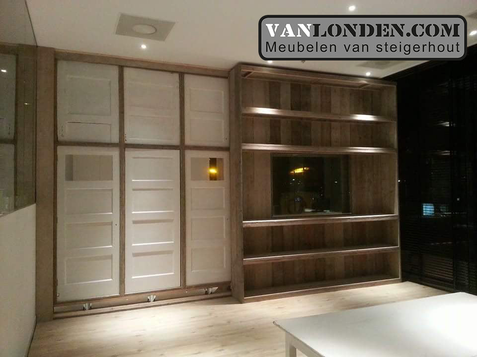 Grote ruimte vullende kast en grote schuifdeur met oude paneeldeuren bij Escaperoom Halte 48 in Breda, waar je moet je zien te ontsnappen door middel van puzzels, raadsel en spellen. En dat allemaal in 48 minuten.