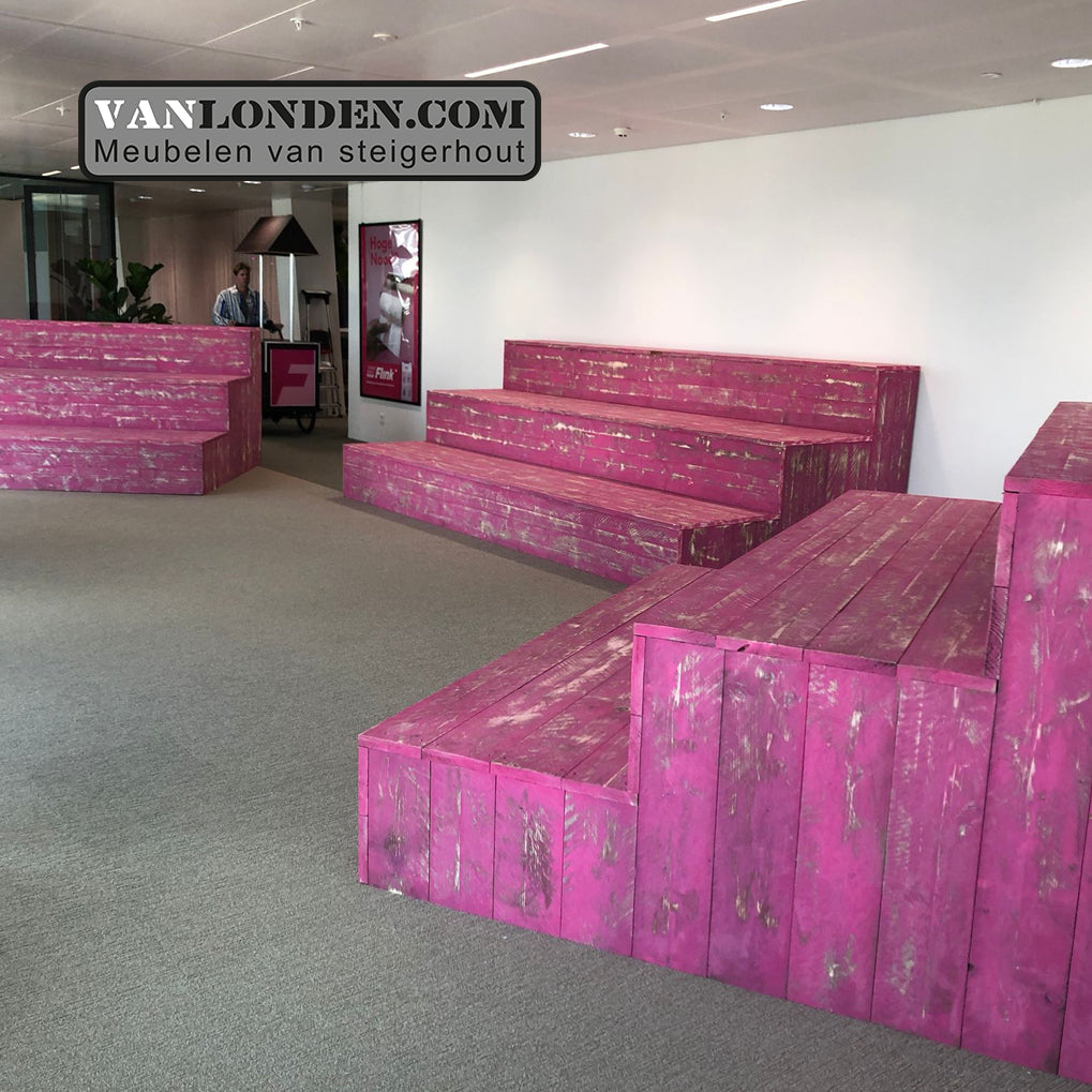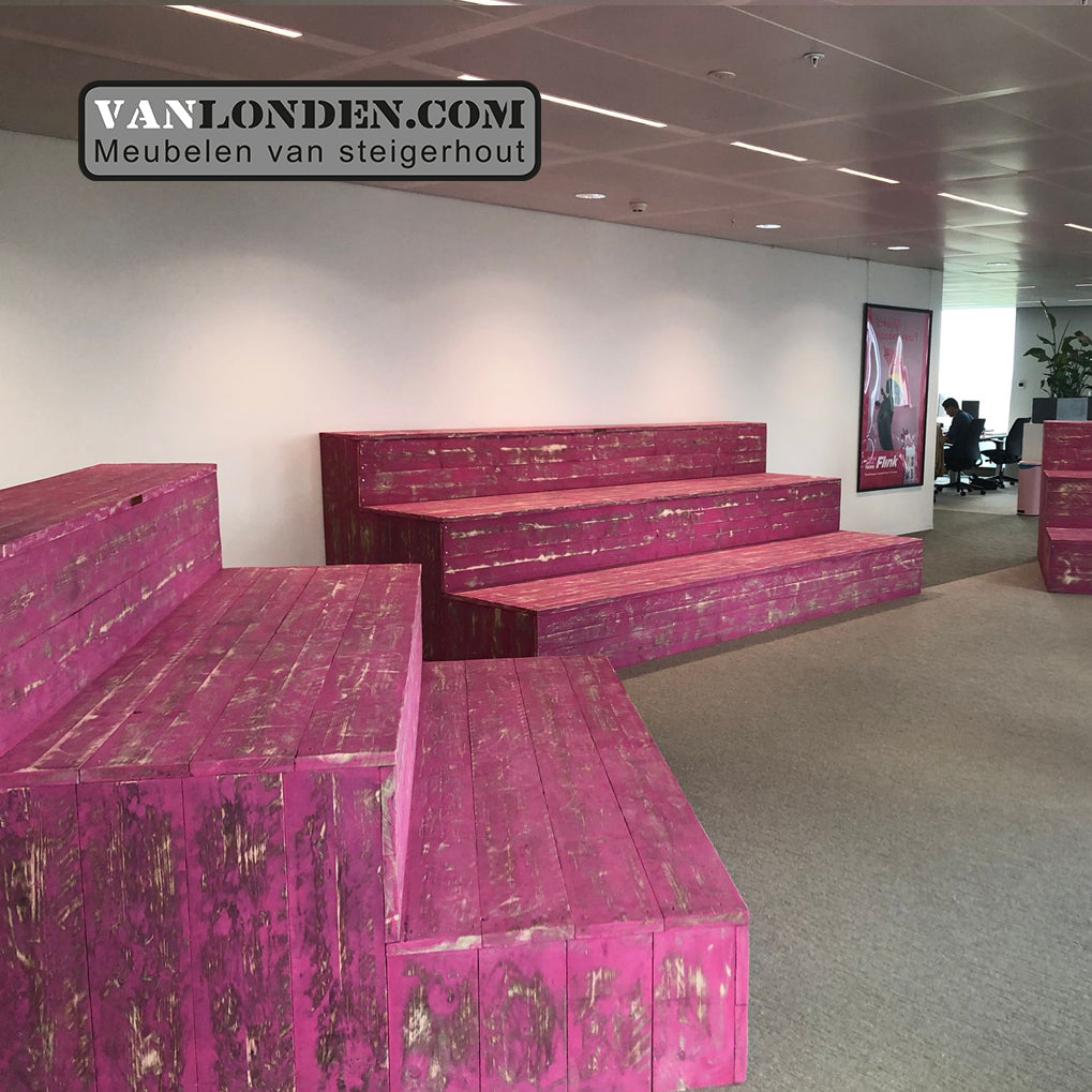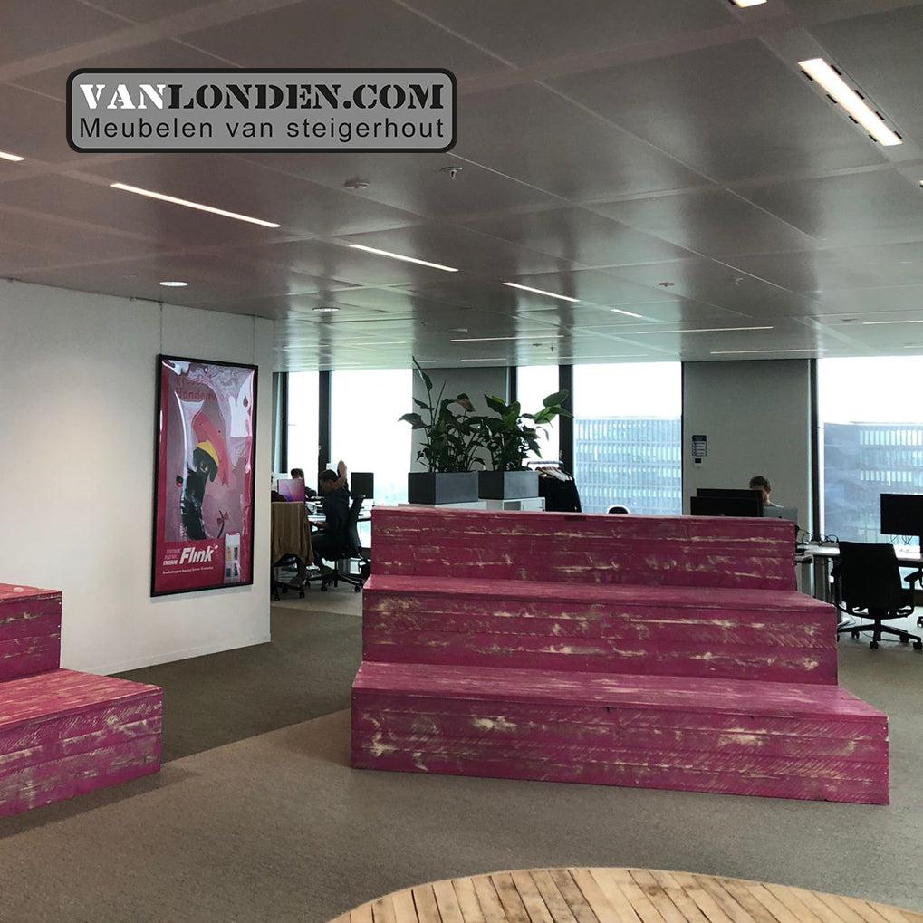 Voor het kantoor van Flink hebben we een mooie steigerhouten inrichting gerealiseerd. Natuurlijk helemaal in Flink stijl.