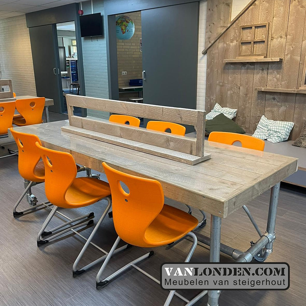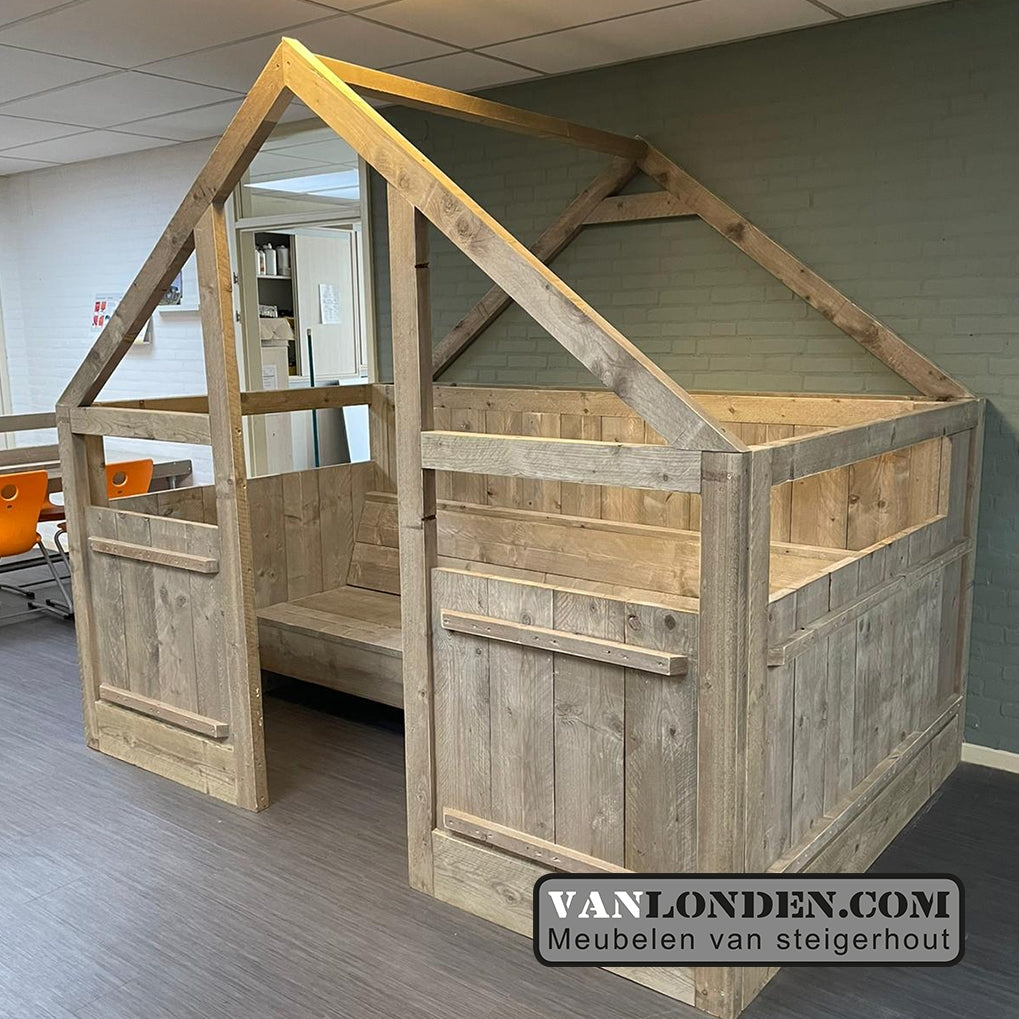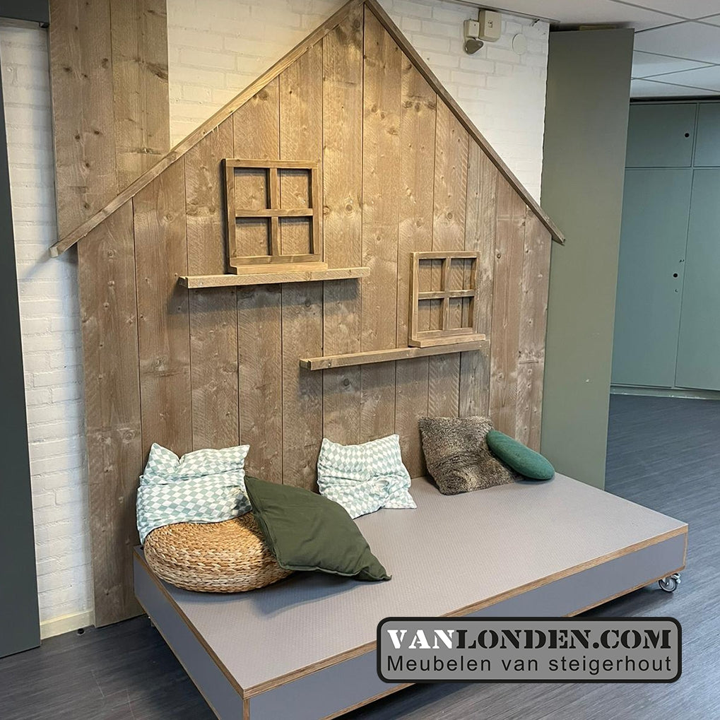 Ook voor kinderdagverblijven en naschoolse opvang zijn interieurs van steigerhout een mooie speelse oplossing. Wil je ook een persoonlijke inrichting voor je bedrijf of instelling? Neem dan contact met ons op.