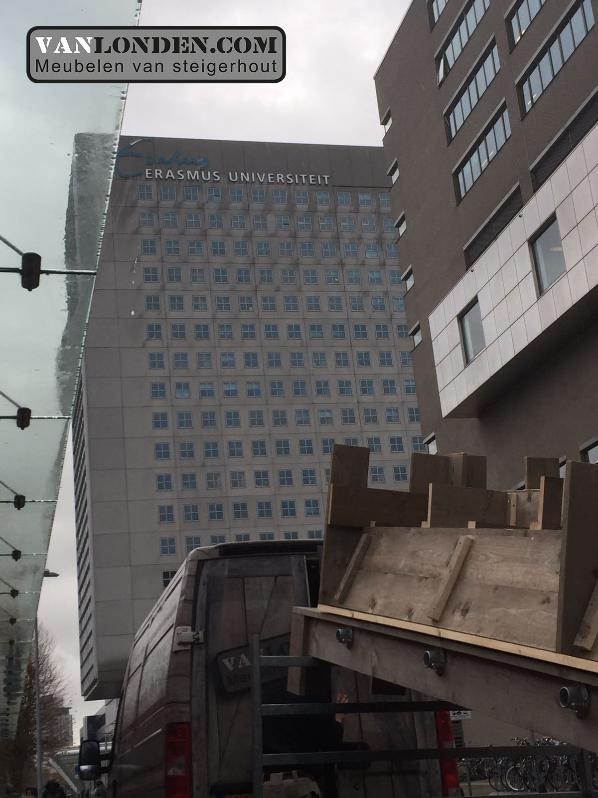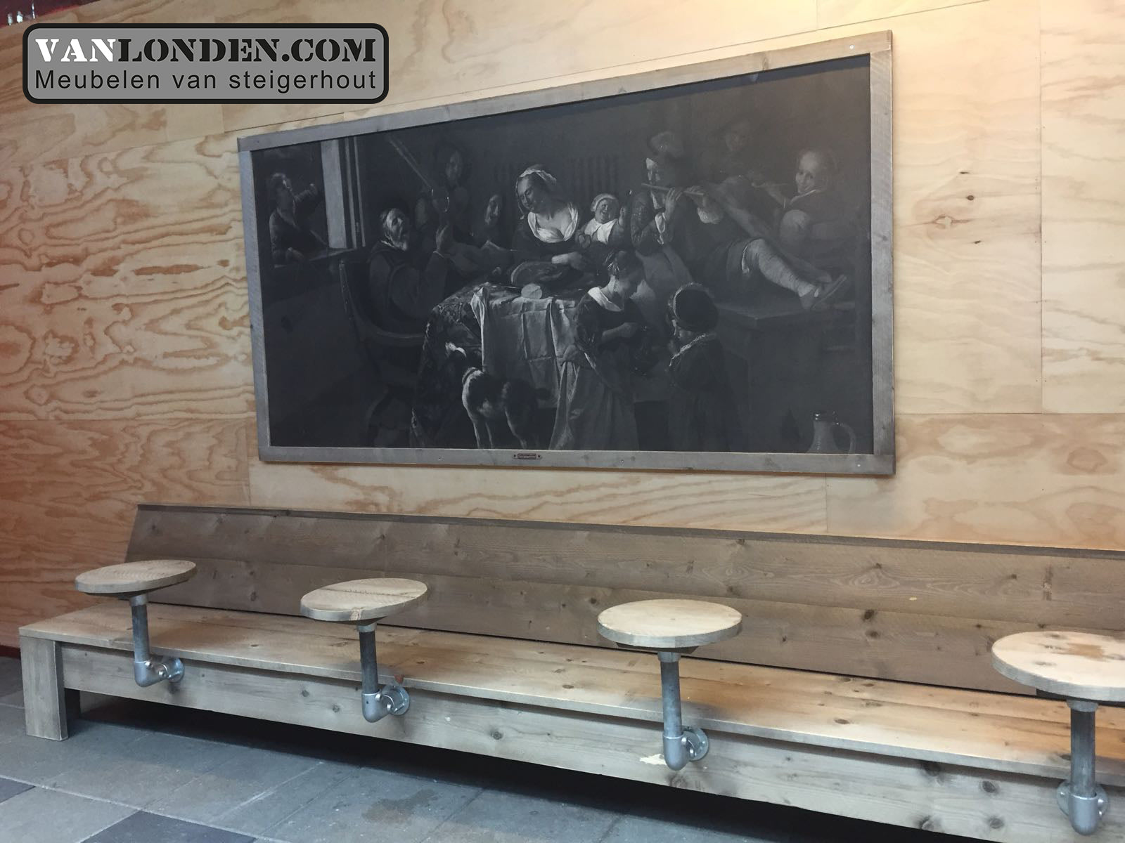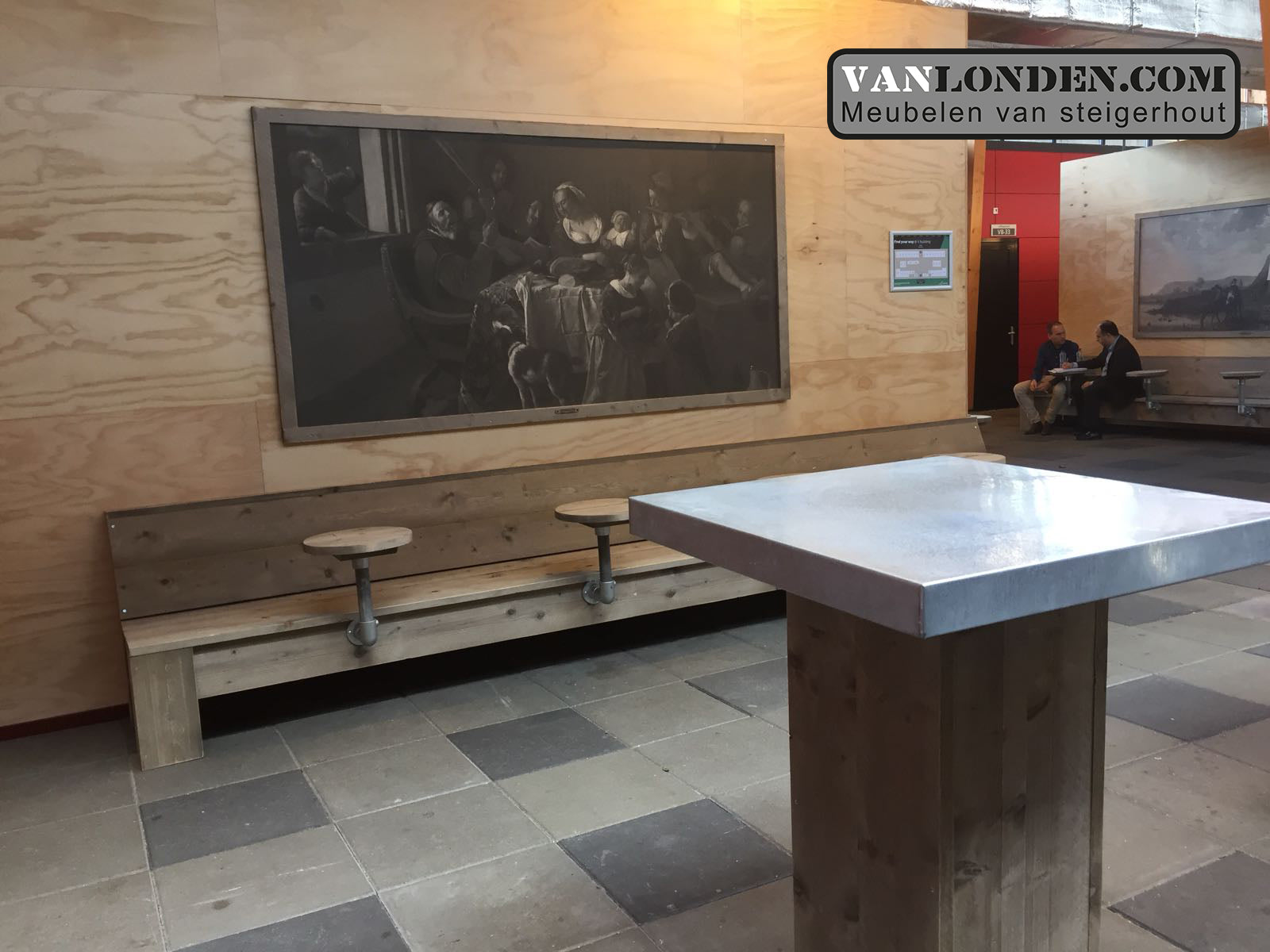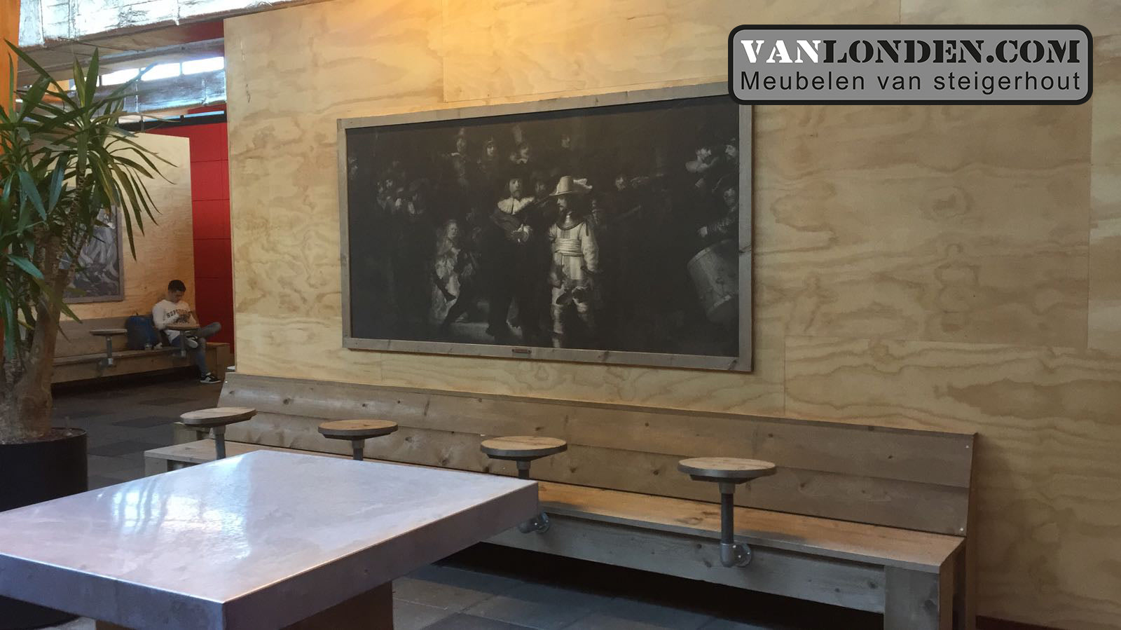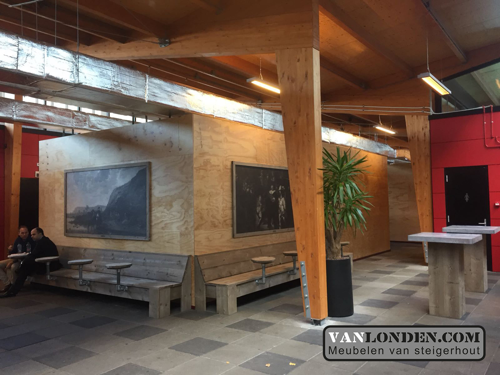 De koffieruimte van de Erasmus universiteit is mooi en eigentijds ingericht met steigerhouten gevelbanken met buistafels van VanLonden.com