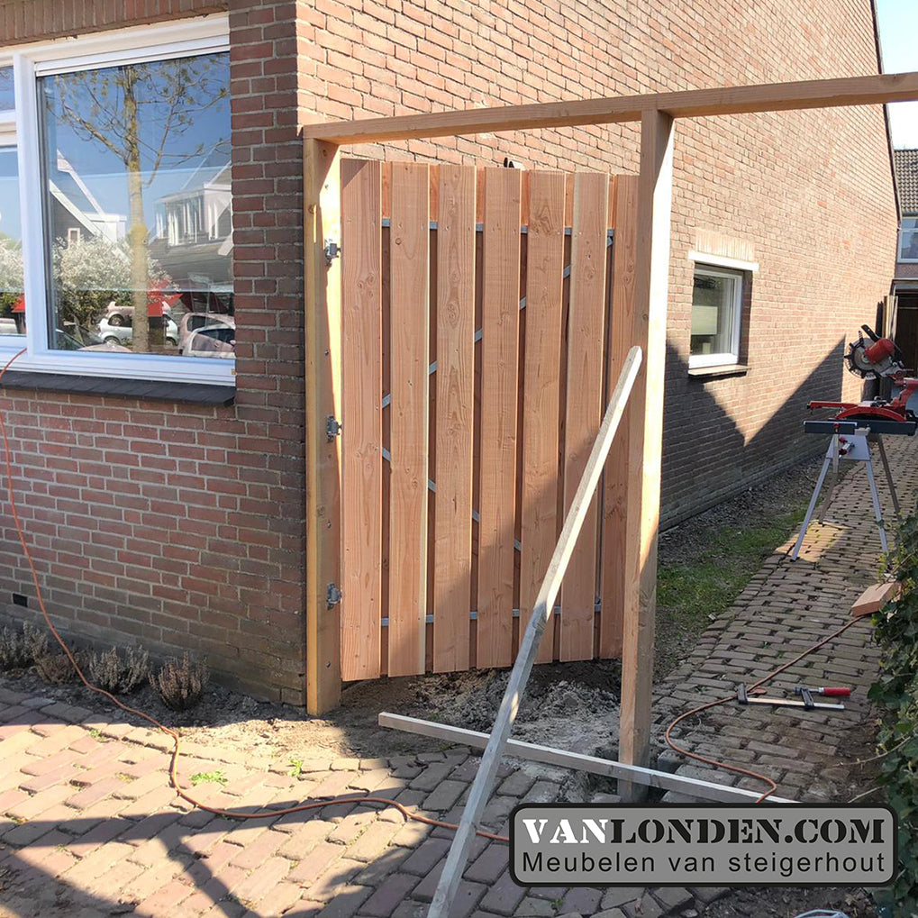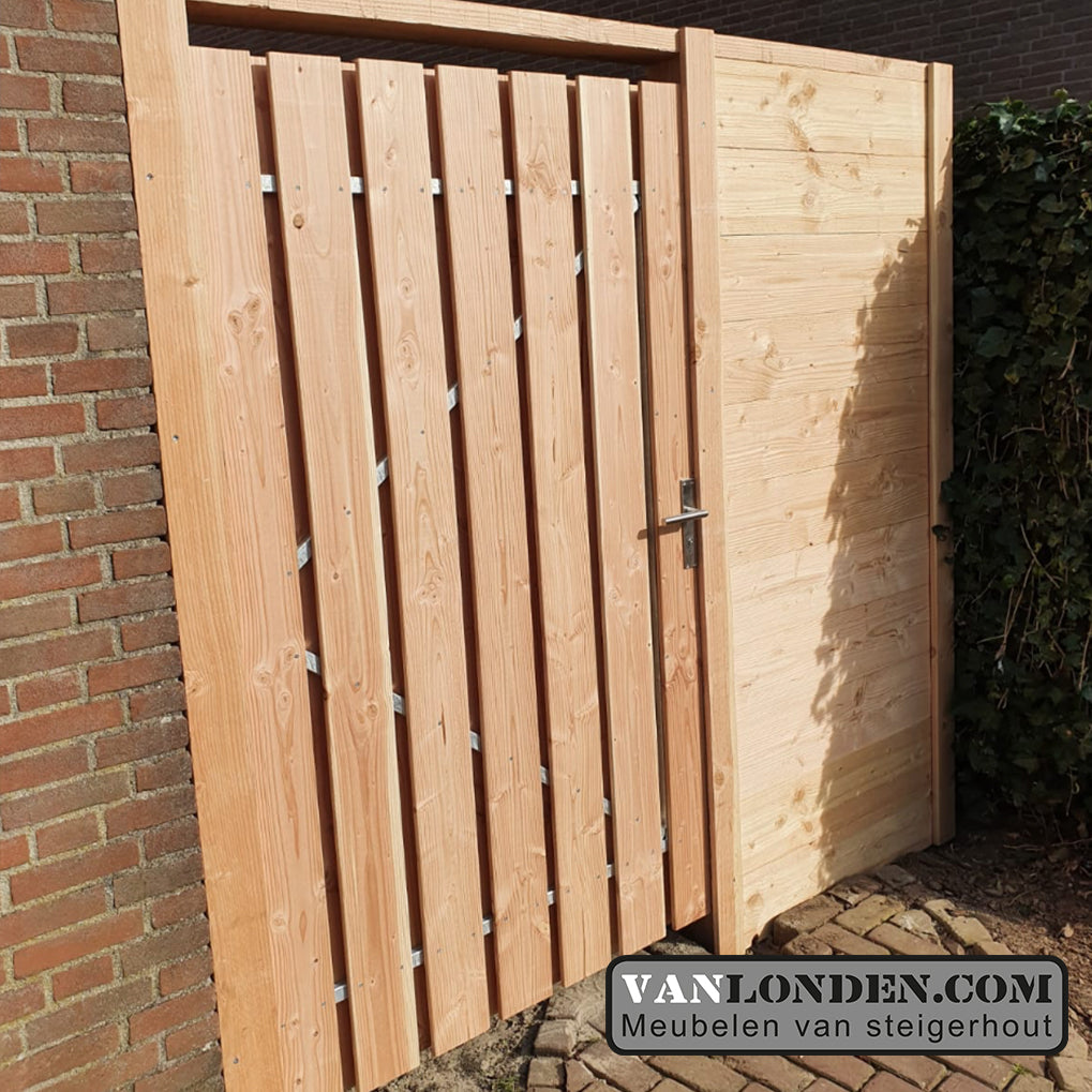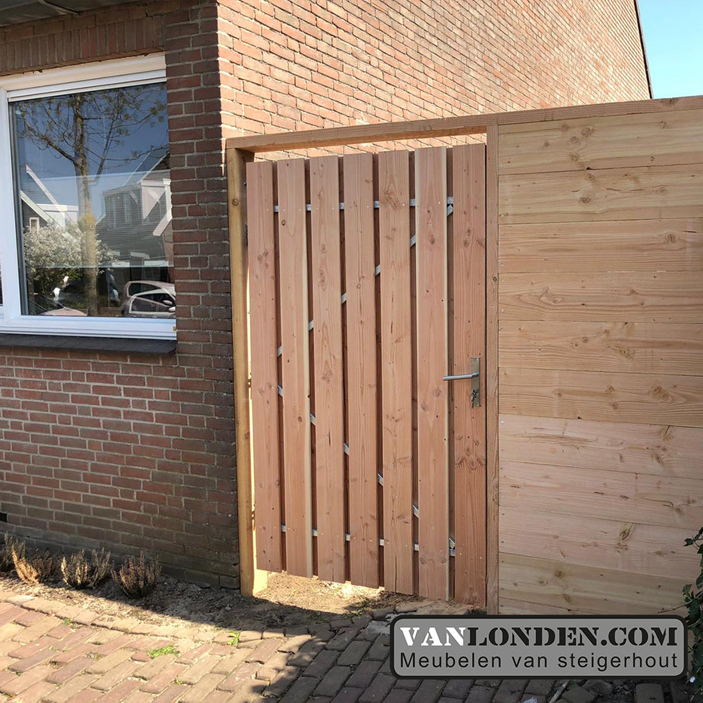 De schutting en poort van Douglas hout heeft een deur met stalen frame met deurbeslag en slot cilinder. De palen staan in beton en zorgen voor een stevige basis. Prijs is op aanvraag.
