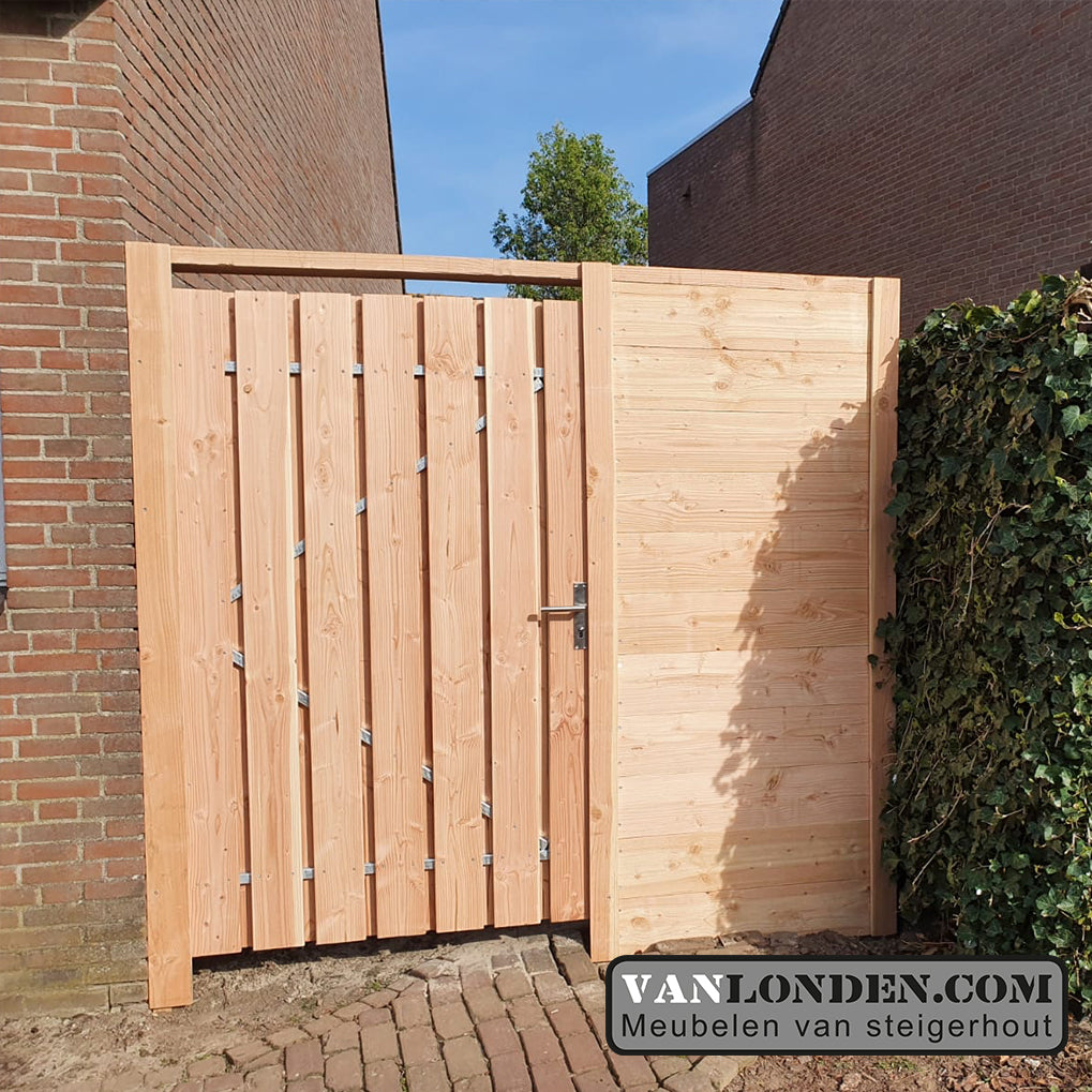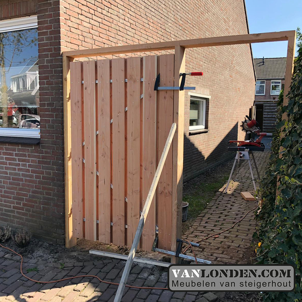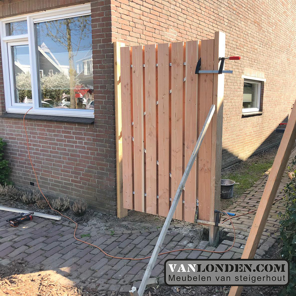 De schutting en poort van Douglas hout heeft een deur met stalen frame met deurbeslag en slot cilinder. De palen staan in beton en zorgen voor een stevige basis. Prijs is op aanvraag.