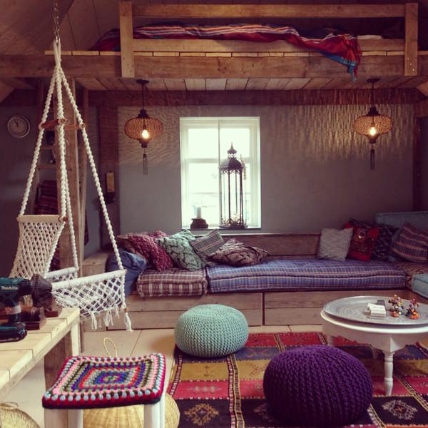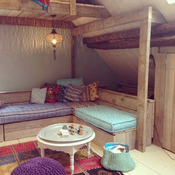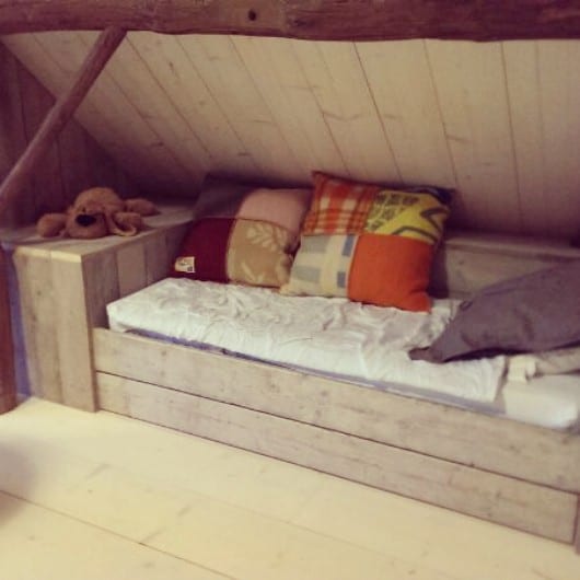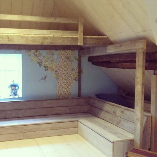 Zolderkamer omgetoverd tot speelkamer. Veel opbergruimtes onder de banken, een ruime kast onder het schuine dak en slaapplaats voor 4 personen.