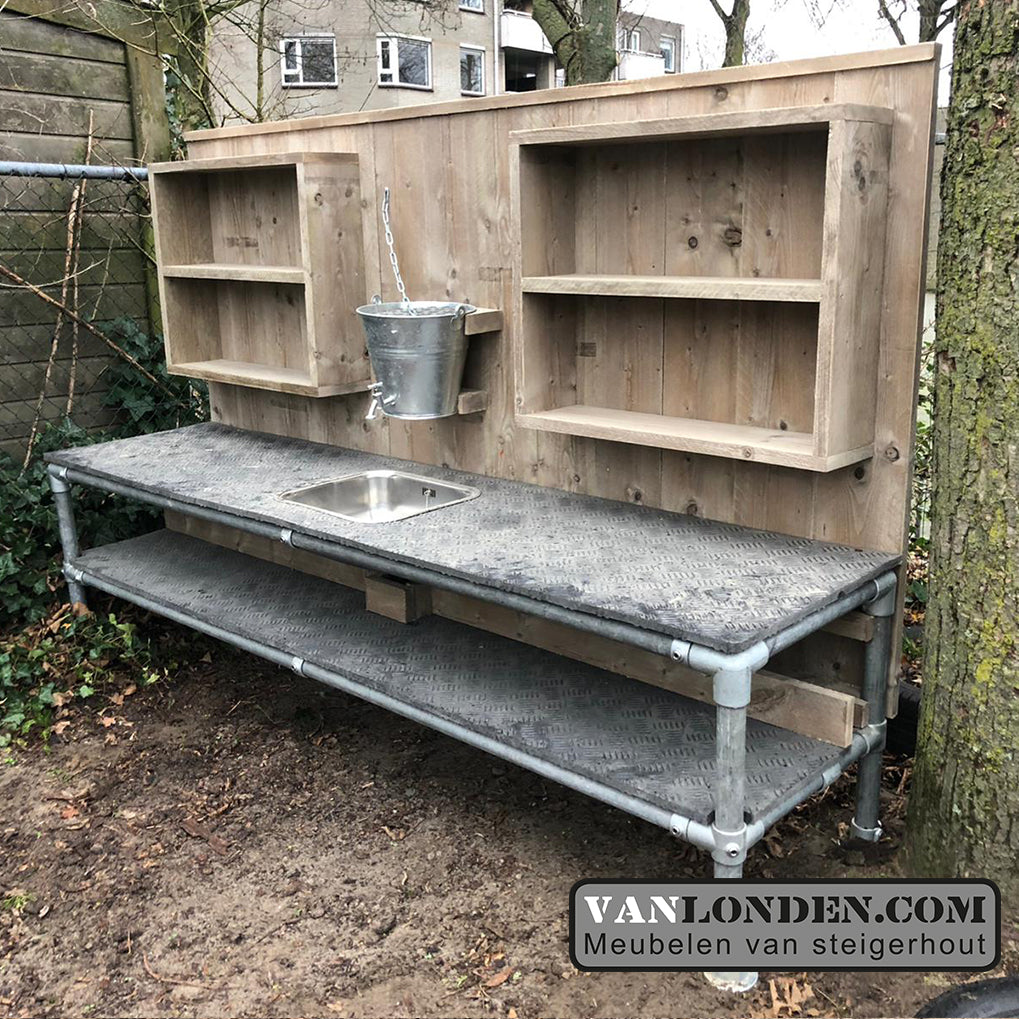 Een heerlijke speelkeuken voor buiten in de tuin of op schoolpleinen of kinderdagverblijf. Lekker spelen met water, die je vanuit de gevulde emmer kunt tappen met het kraantje. Het blad van kunststof is waterbestendig en de keuken is onverwoestbaar door de stalen buizen. lekker modderen maar!