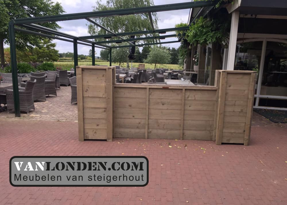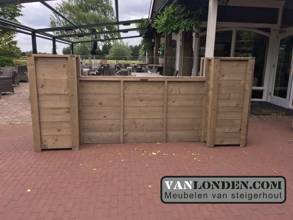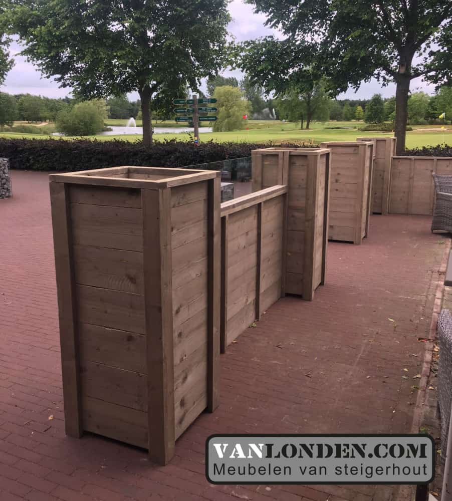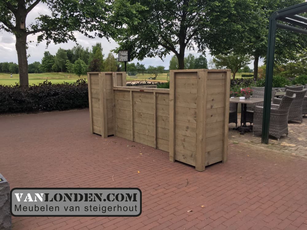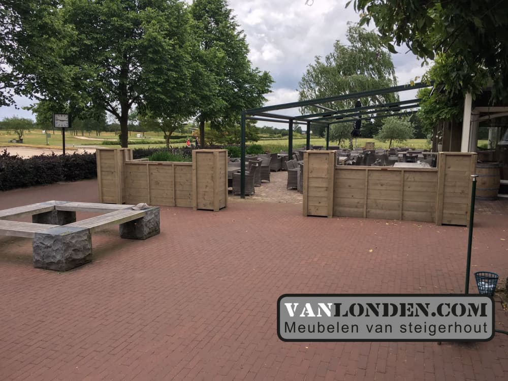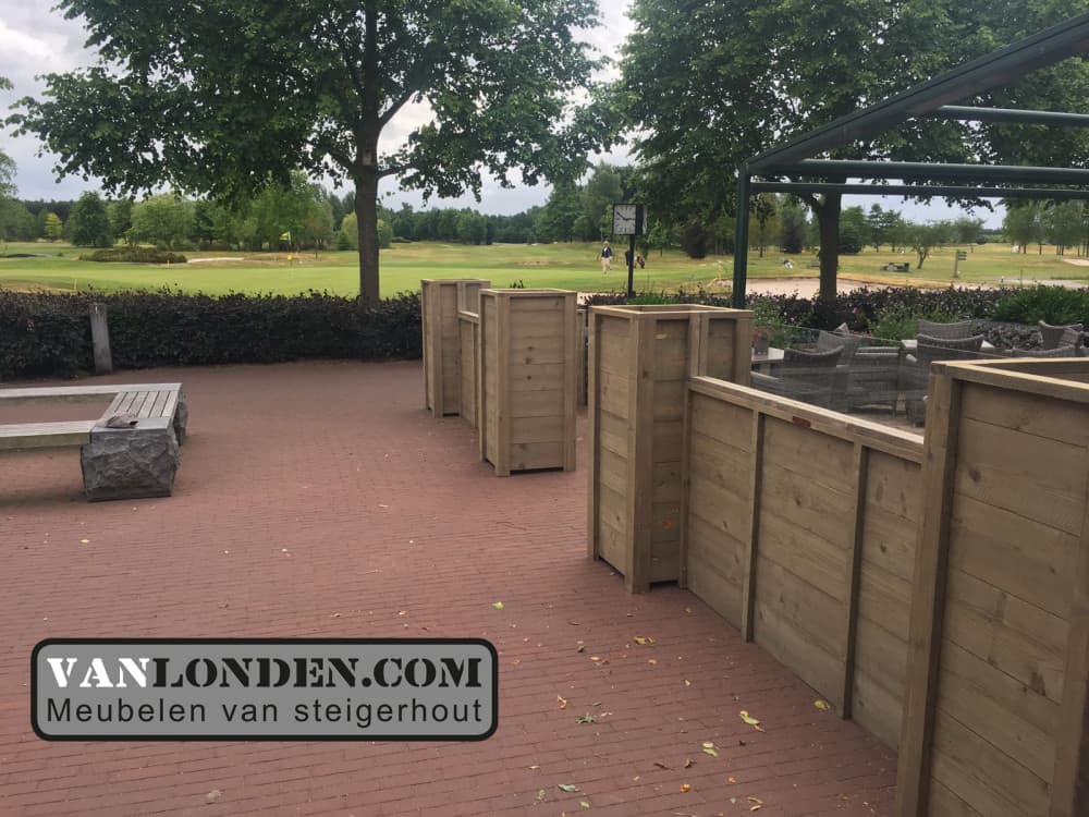 Het terras van Golfbaan Prinsenbosch ziet er weer top uit met de mooie steigerhouten terraswanden.