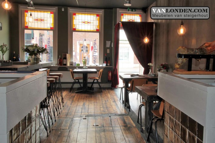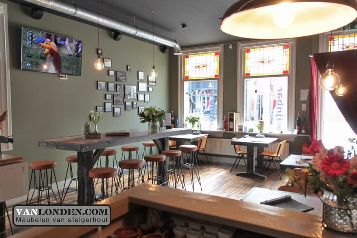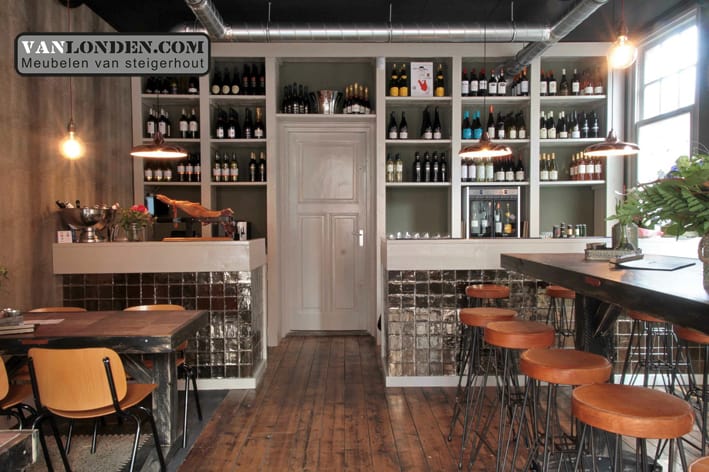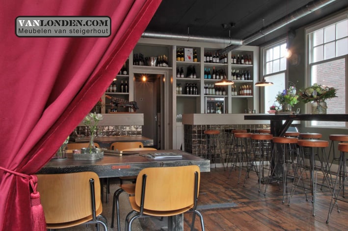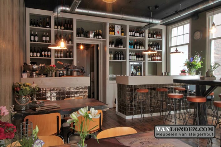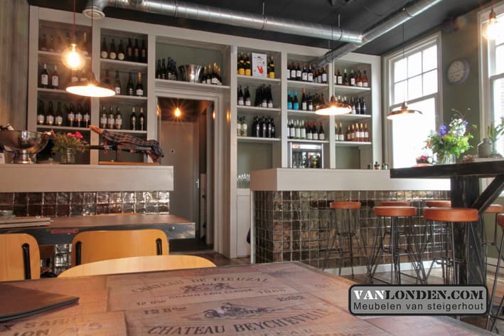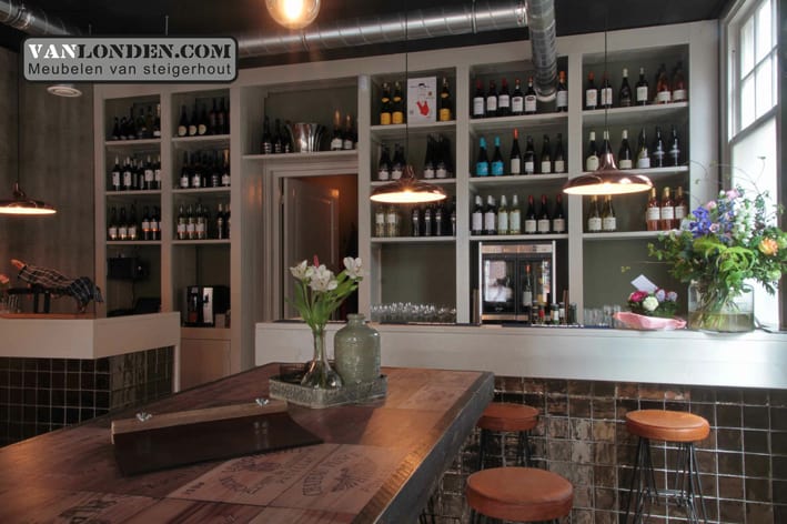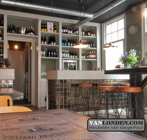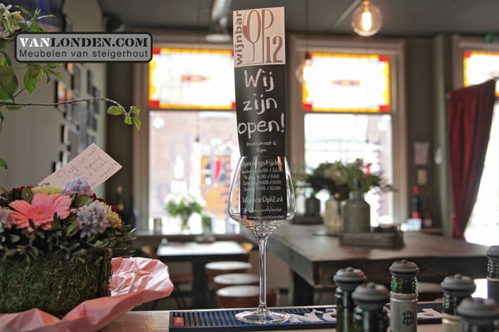 Wijnbar OP12 in Rijen, een mooie bar waar je kunt genieten van een heerlijk glas wijn! VanLonden.com heeft hiervoor de bar, tafels en achterwand kast mogen maken.