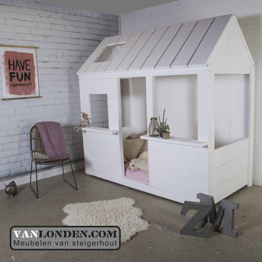 In ons kinderbedassortiment staan verschillende soorten steigerhout huisjes om in te slapen en te spelen. Een halfhoogslaper met een speelhut is een ruimtebesparende oplossing voor de kleinere slaapkamers maar is natuurlijk ook geschikt voor grote slaapkamers. We hebben zelfs huisjes in de vorm van een gevelbed of trapgevelbed. Dit zijn ook steigerhouten huisjes maar dan net even anders. In het gevelbed met bedstee heb je de mogelijkheid om beneden of boven te slapen, klim je via de ene zijkant omhoog en de andere zijkant biedt ruimte voor een opbergkast. Of wat dacht je van een pakhuisbed, hoogslaper Kaj of een bed in de vorm van een huis compleet met deur en ramen? Kortom, te veel huisjesbedden om op te noemen.