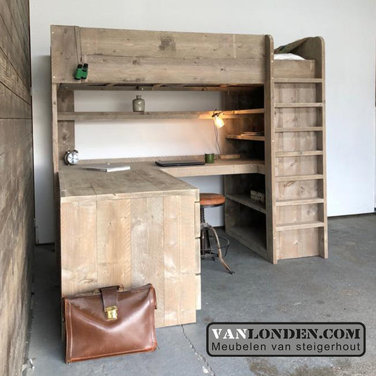 Steigerhouten hoogslaper met bureau en kast Cecilia