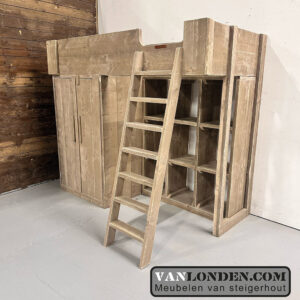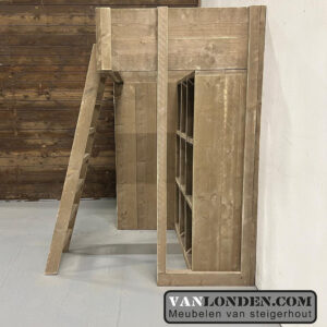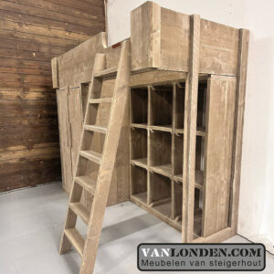 Deze steigerhouten hoogslaper Janneke is een superoplossing voor kleine slaapkamers, zoals studentenkamers. De hoogslaper heeft onder het bed een tweedeurskast met een hang- en legruimte. En daarnaast onder het bed nog een leuke vakkenkast. Heel veel opbergruimte voor het opbergen van kleding, boeken en allerhande spullen. Aan de voorkant zit een stevige trap naar de hoogslaper. Origineel en handig bed dus!