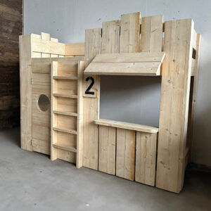Hoogslaper Thijmen is een kinderbed en speelhuis ineen. Boven slapen en beneden spelen in het winkeltje. En wanneer je beneden een matras (200×90) neerlegt, verandert dit prachtige steigerhouten kinderbed in een stapelbed.