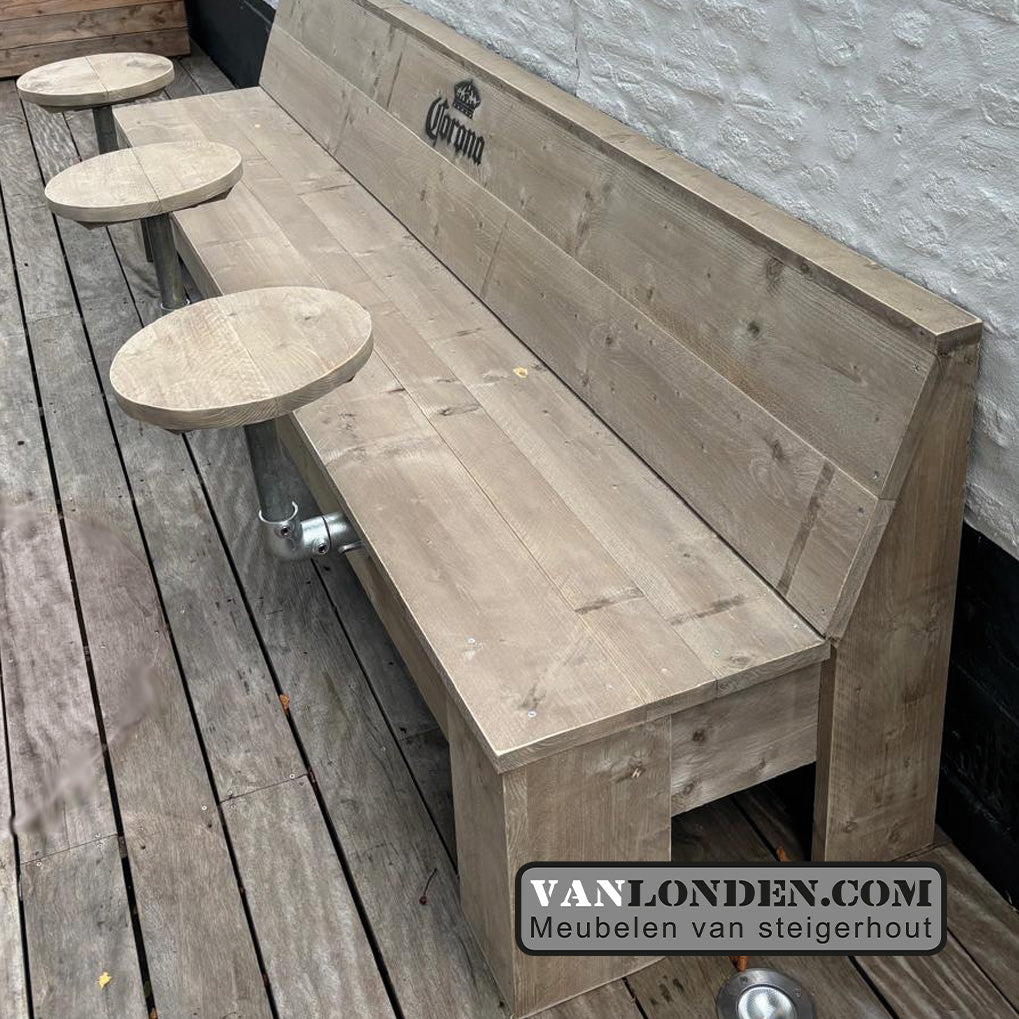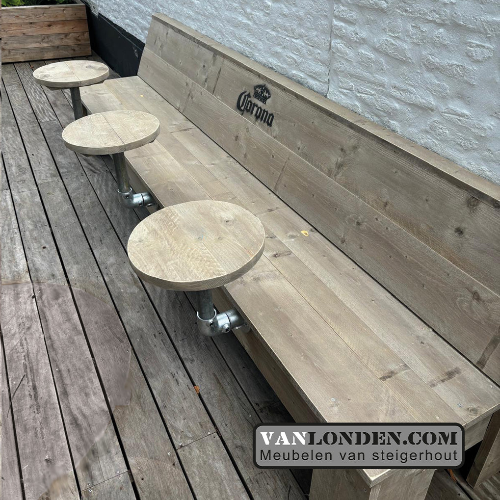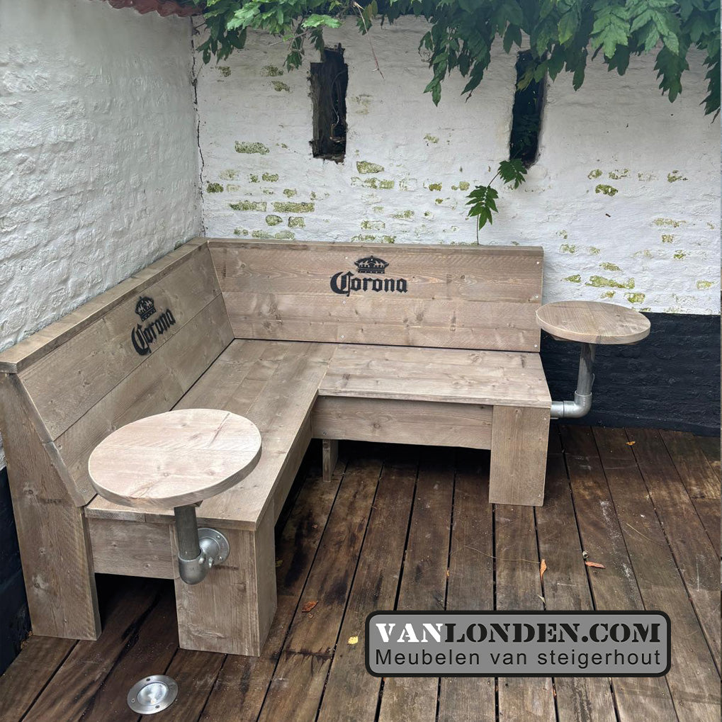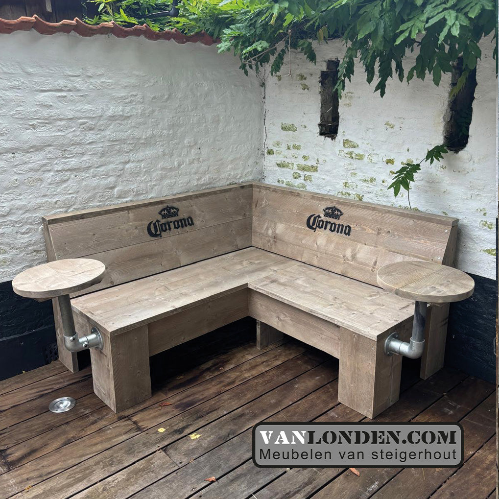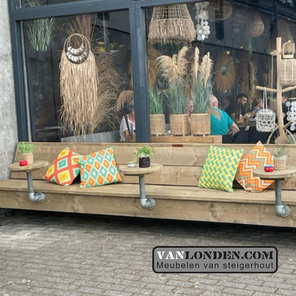 Steigerhouten terrasbank met 2 bijzettafel(s) er aan vast. De bank is ook verkrijgbaar met meerdere bijzettafels.