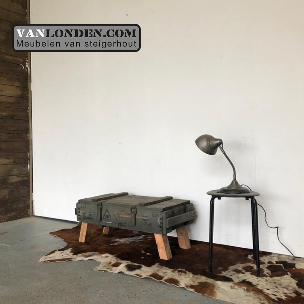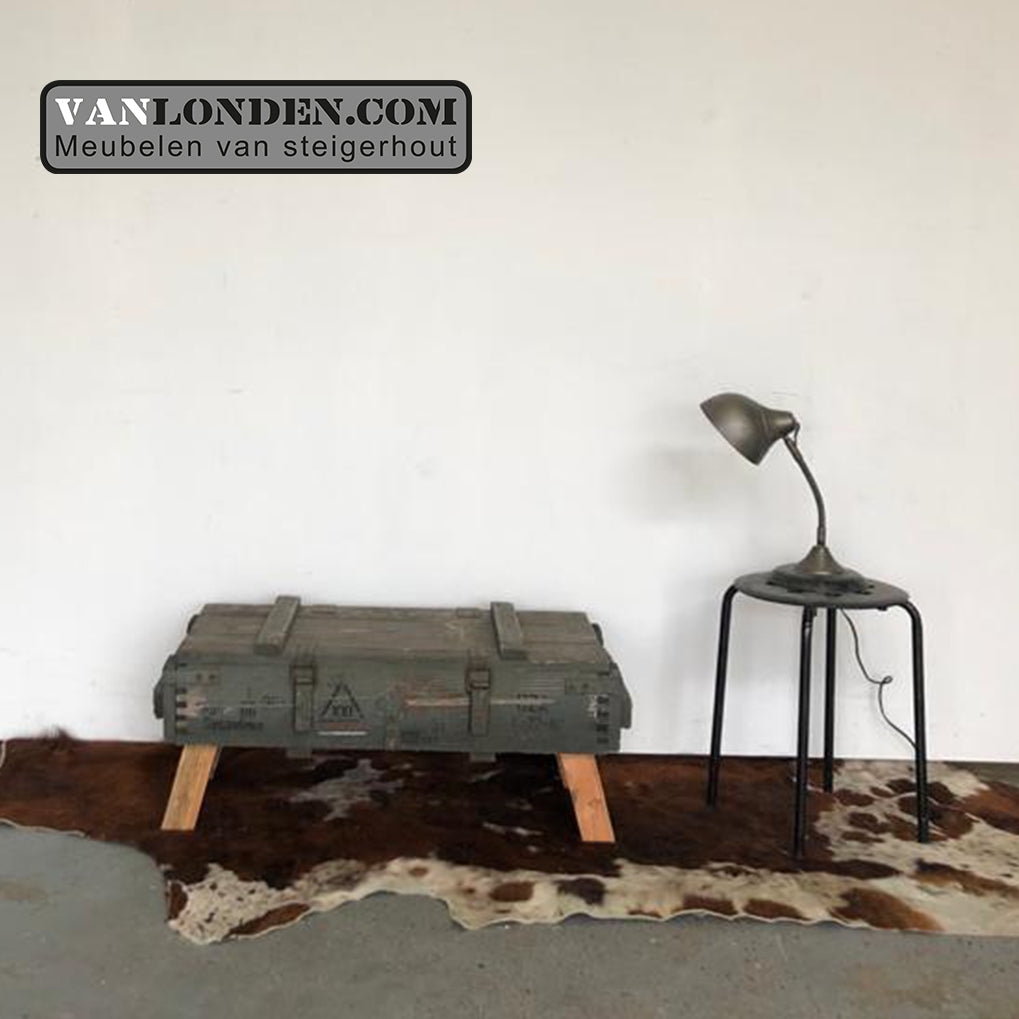 Oude legerkist op pootjes, authentiek en stoer, bijvoorbeeld te gebruiken als bijzettafeltje.