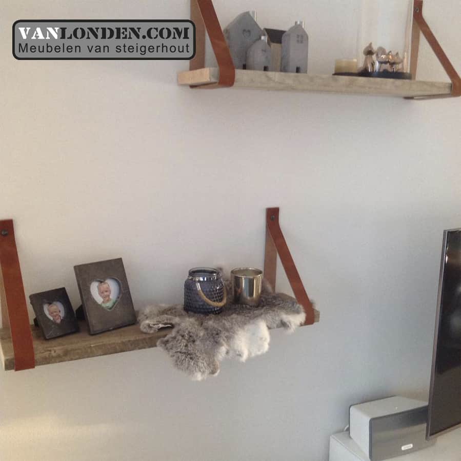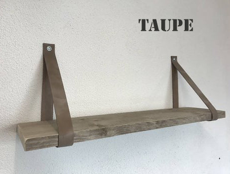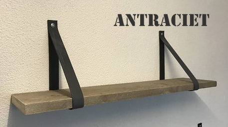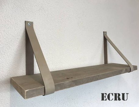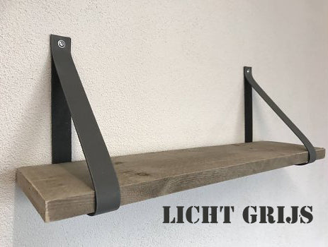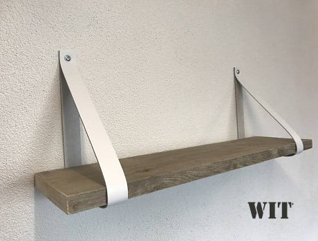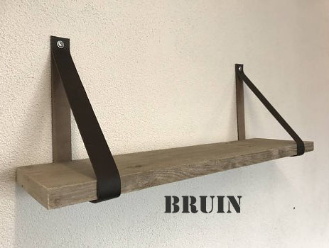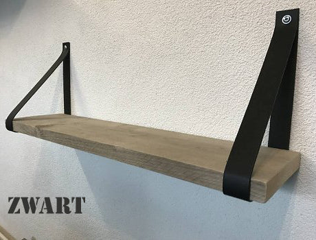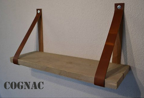 De leren banden zijn verkrijgbaar in 10 kleuren, 4 cm breed en ongeveer 86 cm lang. De set bestaat uit 2 leren banden, incl. bevestigingsmateriaal, stoere bouten en pluggen. De plank is verkrijgbaar in 60, 80 en 100cm. zonder prijsverschil.