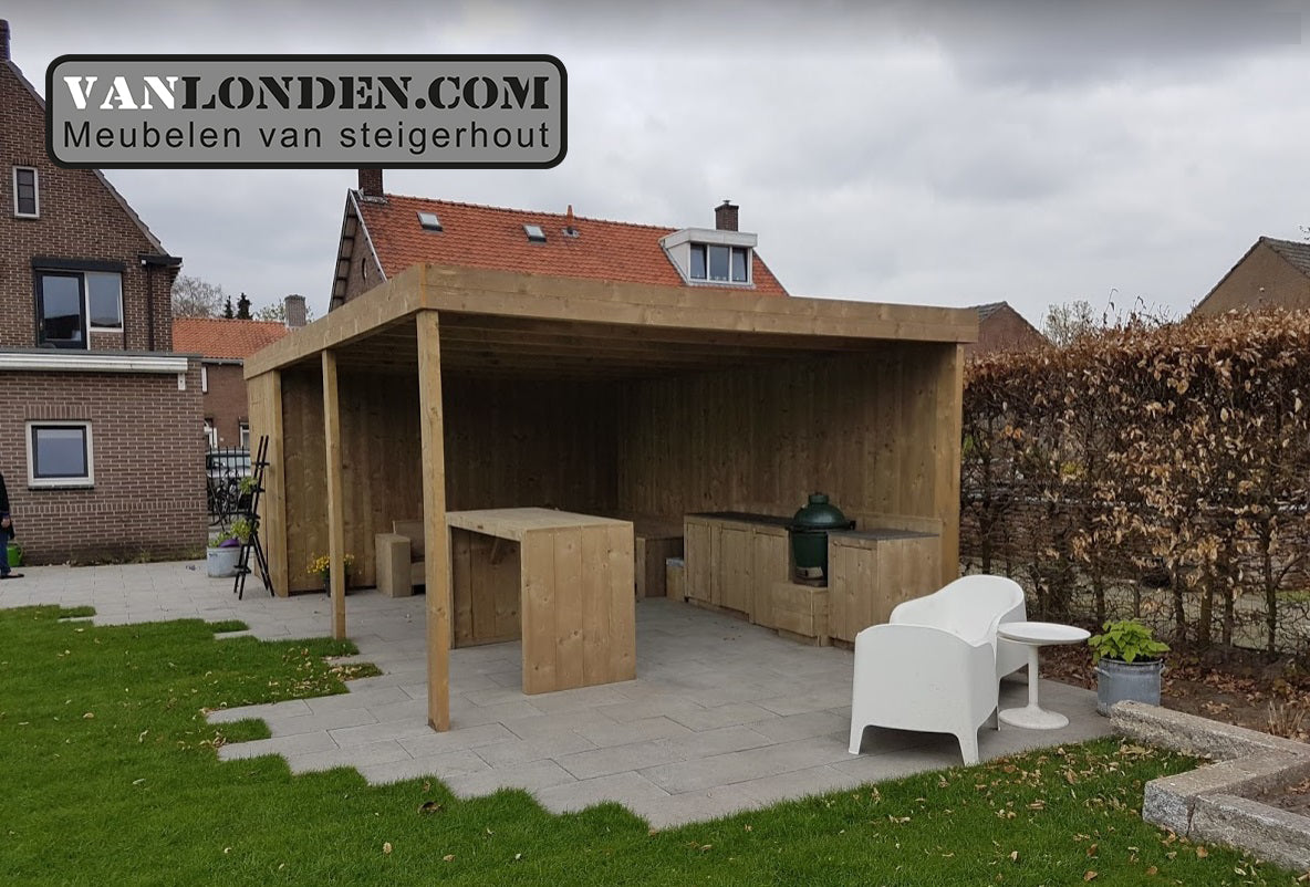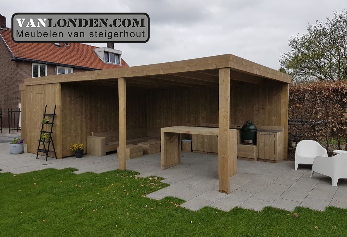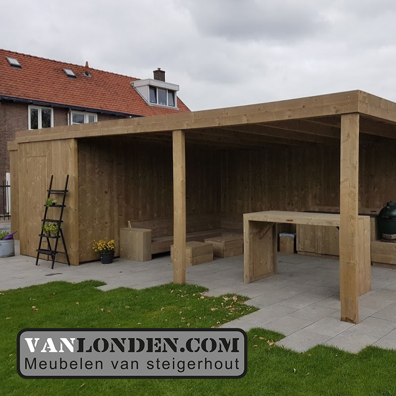 Steigerhouten overkapping met schuur en buitenkeuken, er zijn verschillende opties mogelijk. Neem voor meer informatie en prijzen contact met ons op! Steigerhouten overkapping met schuur en buitenkeuken, er zijn verschillende opties mogelijk. Neem voor meer informatie en prijzen contact met ons op!