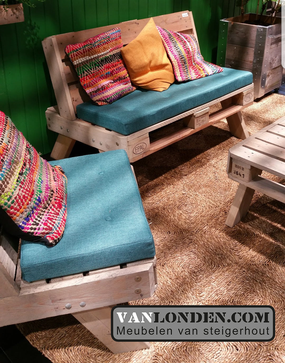 Pallet bank Tibbe, Stoer, stevig en sfeervol voor op je terras, tuin of onder een veranda. De zitkussens op de foto zijn apart te bestellen, meerprijs zitkussen € 99,95