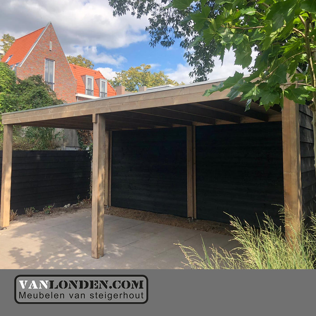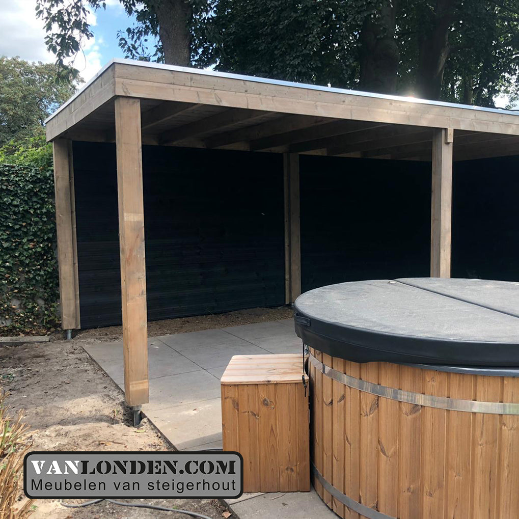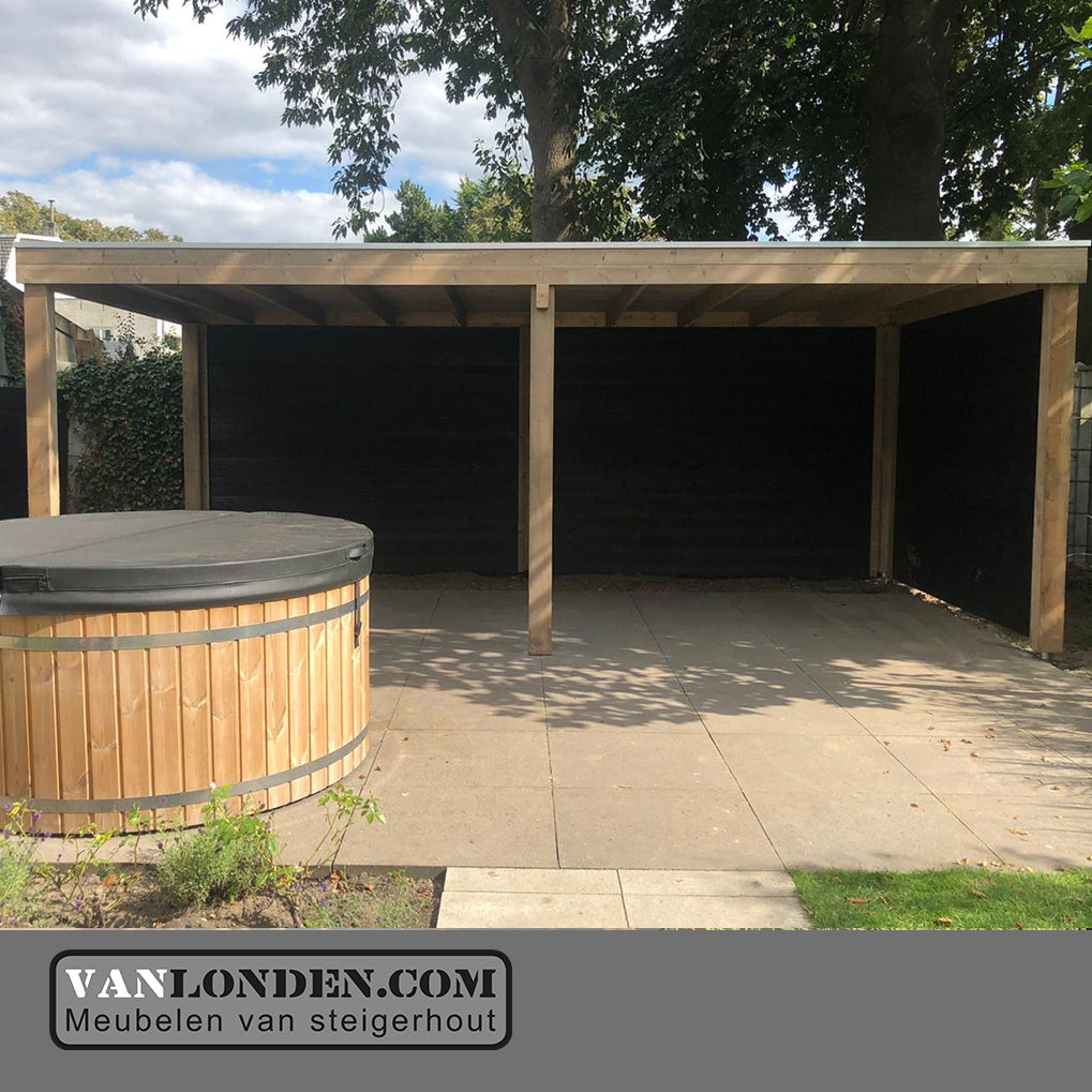 Steigerhout overkapping Rowan met zwarte zweedse rabat wanden
