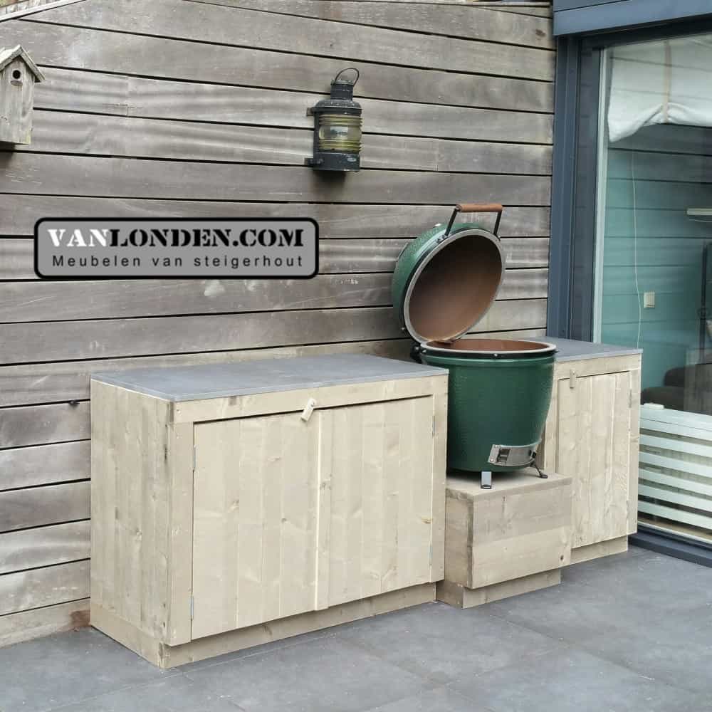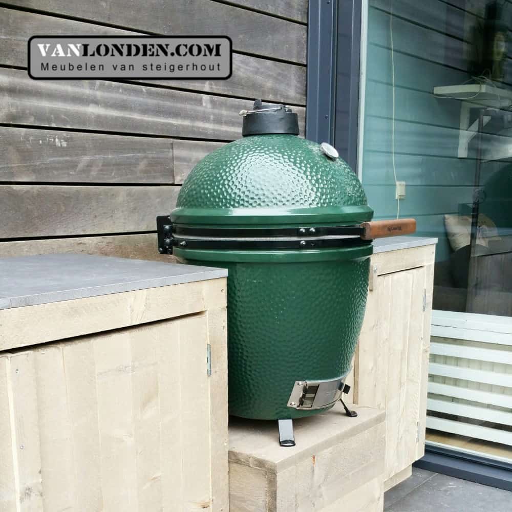 Deze Steigerhouten buitenkeuken Barry is geschikt als ombouw voor de Green Egg om weer heerlijk buiten te kunnen koken. Met praktische opbergruimte voor alle accessoires.