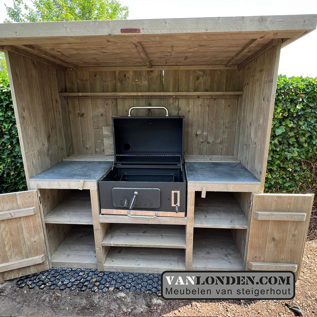Heerlijk Barbecuen met zomerweer! Een buitenkeuken waar je alle benodigdheden in kunt opbergen. Mooi opgeborgen achter deurtjes van de 2 kastjes onderin en overkapt zodat alles droog blijft.