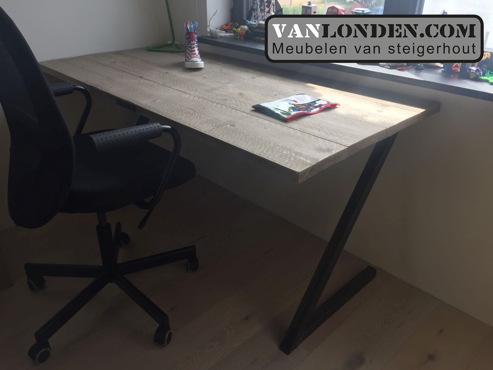 Mooi steigerhouten bureau met industriele z-poten van staal. Stoer door een breed blad van 120cm. De lade is optioneel, kijk hiervoor bij bestelmogelijkheid hieronder.