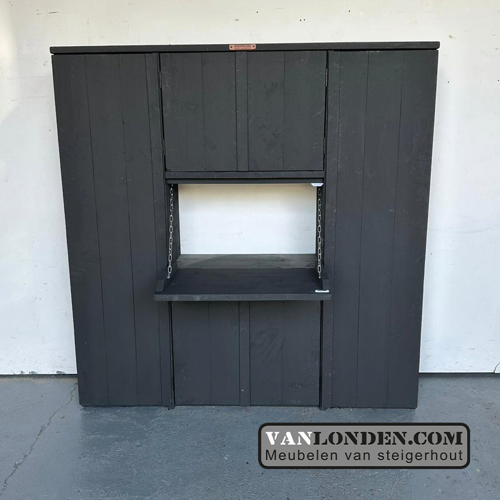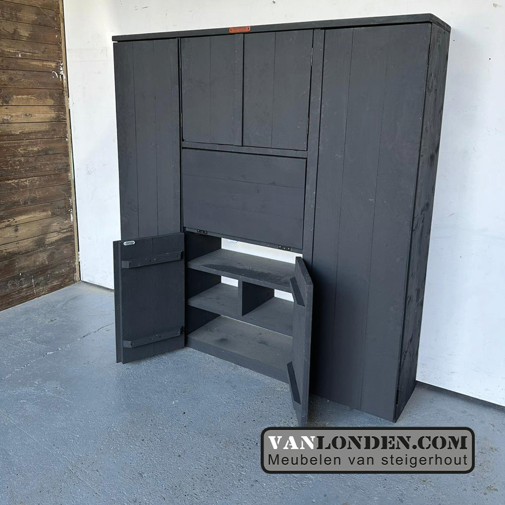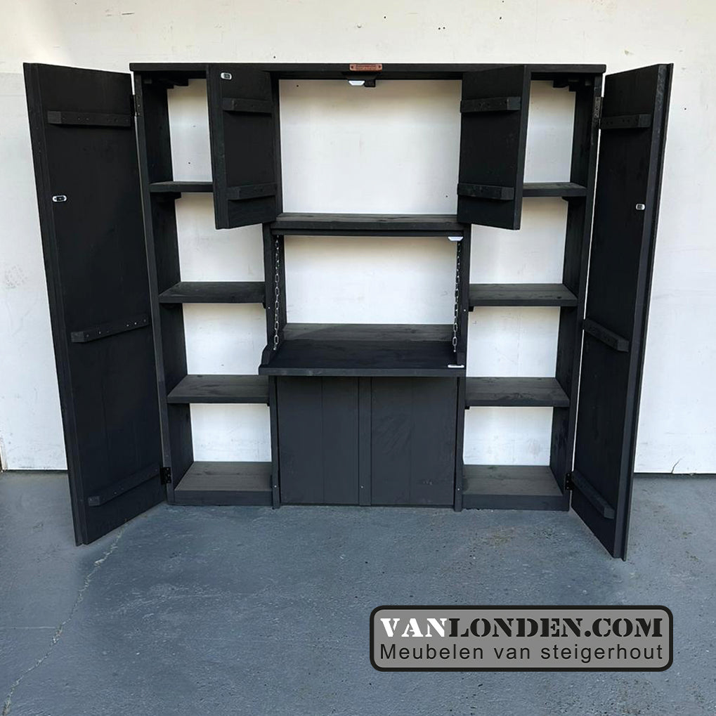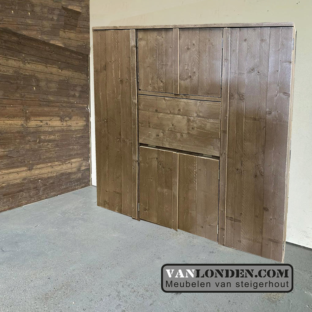De kast wordt standaard geleverd in naturel steigerhout, maar kan natuurlijk ook in kleur, zoals op de foto. Kijk hiervoor bij de bestelmogelijkheden hieronder.