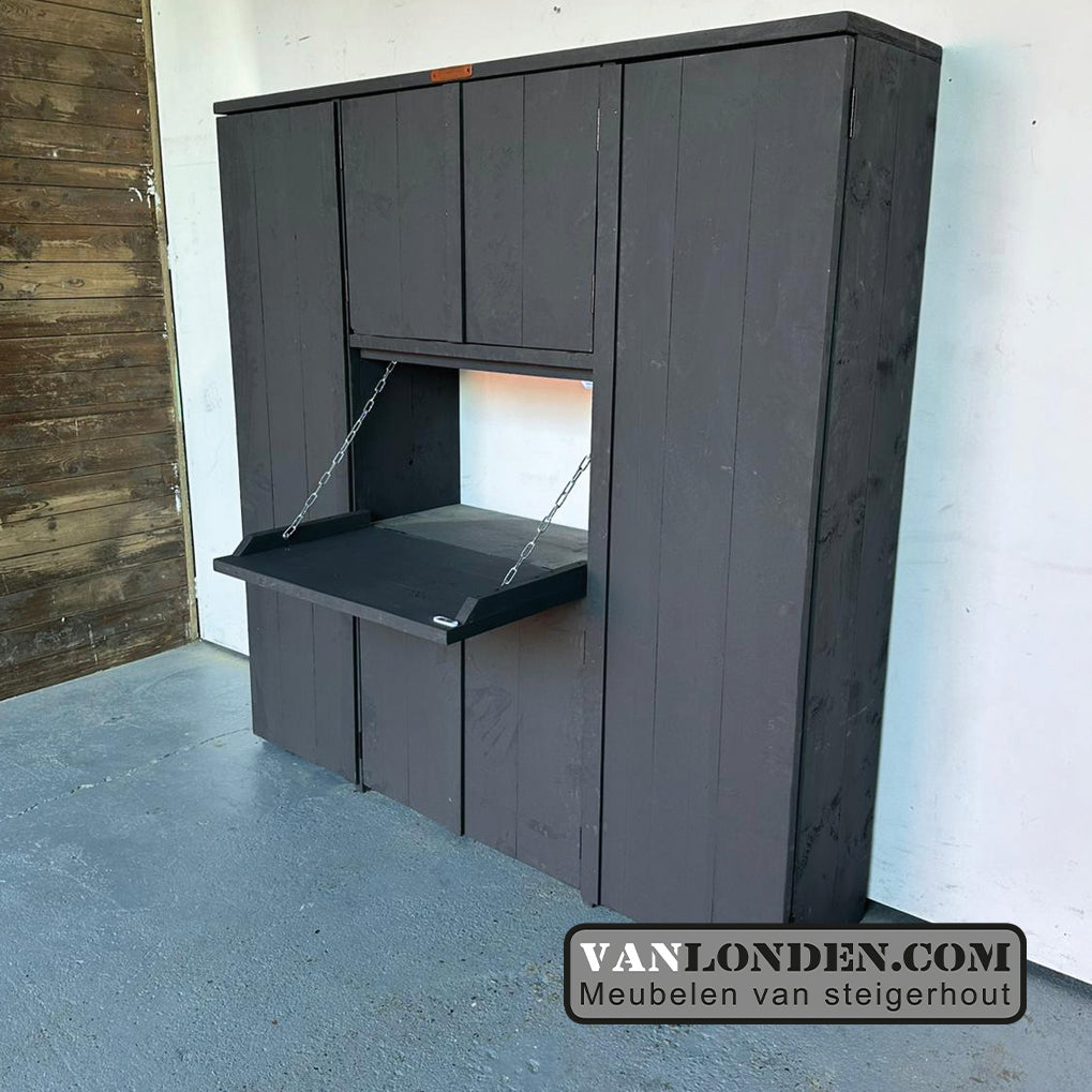 Mooi strak vormgegeven ruime kast met openklappende deuren. Geïntegreerd in de kast is een uitklapbaar bureaublad met achter de omliggende deuren planken voor extra opbergruimte!