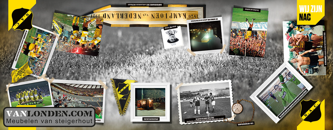 Industriële steigerhouten foto print tafel. Stoer afgewerkt met een buisframe onderstel op wielen. In dit voorbeeld is de tafel gemaakt als NAC Vip tafel.