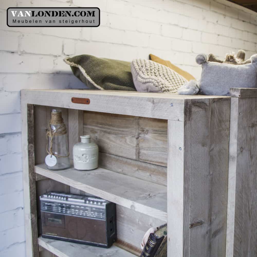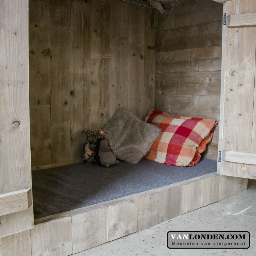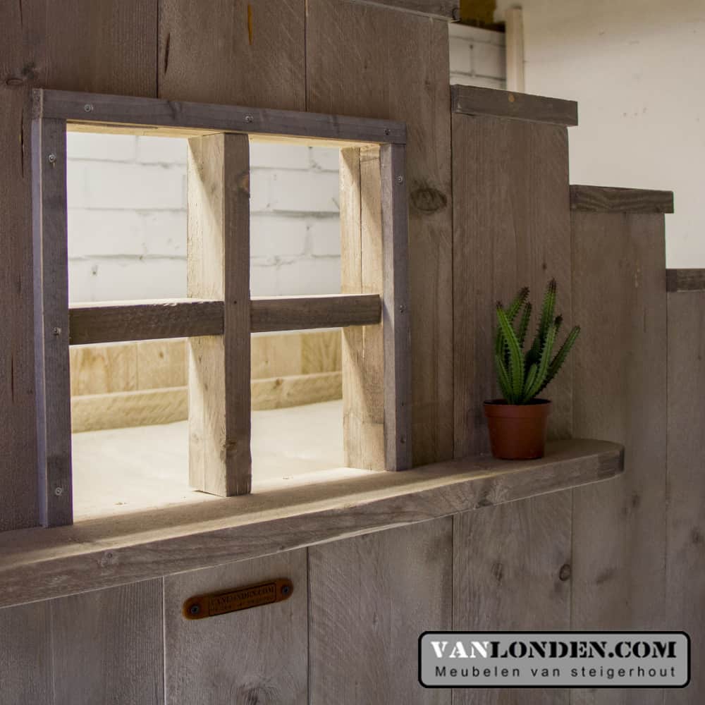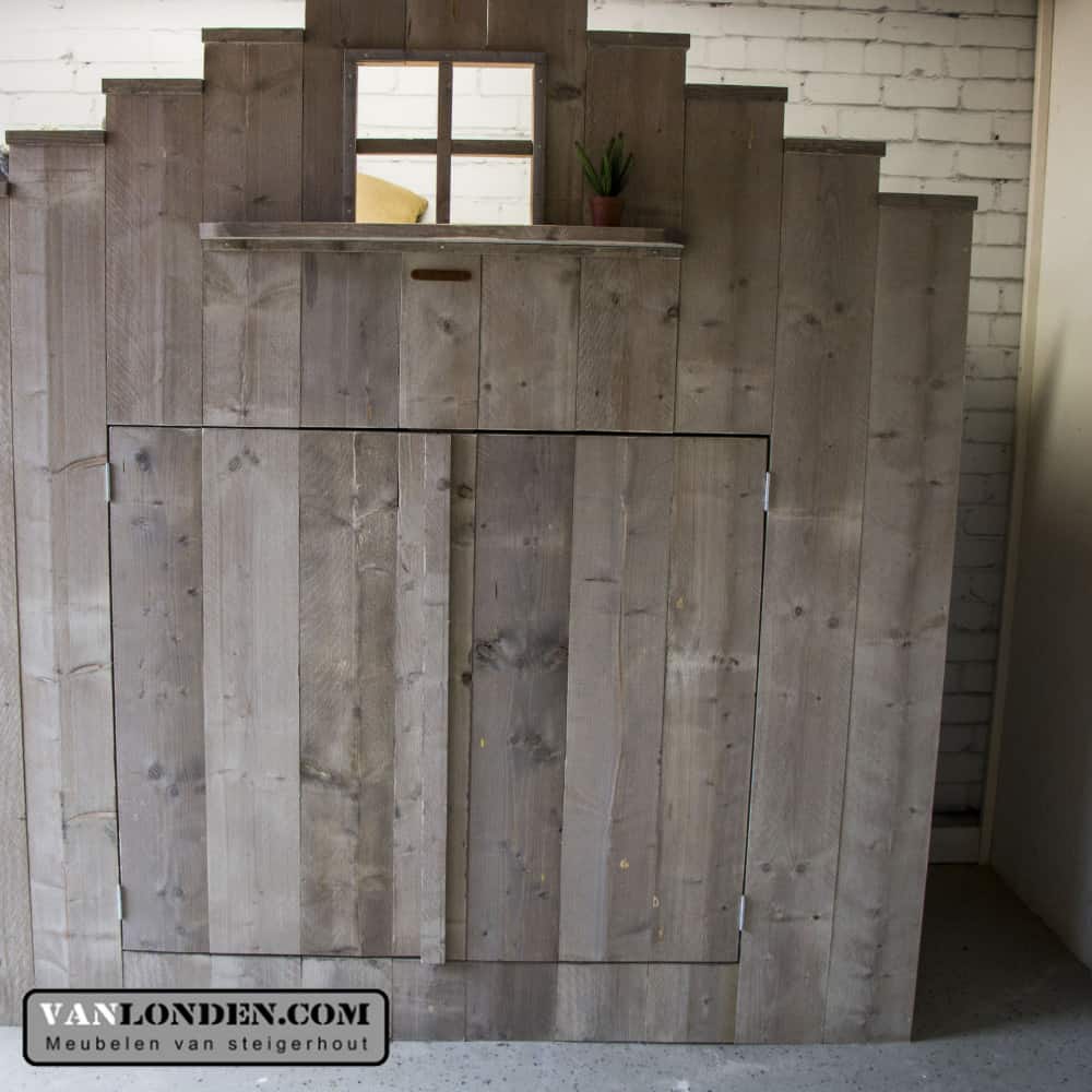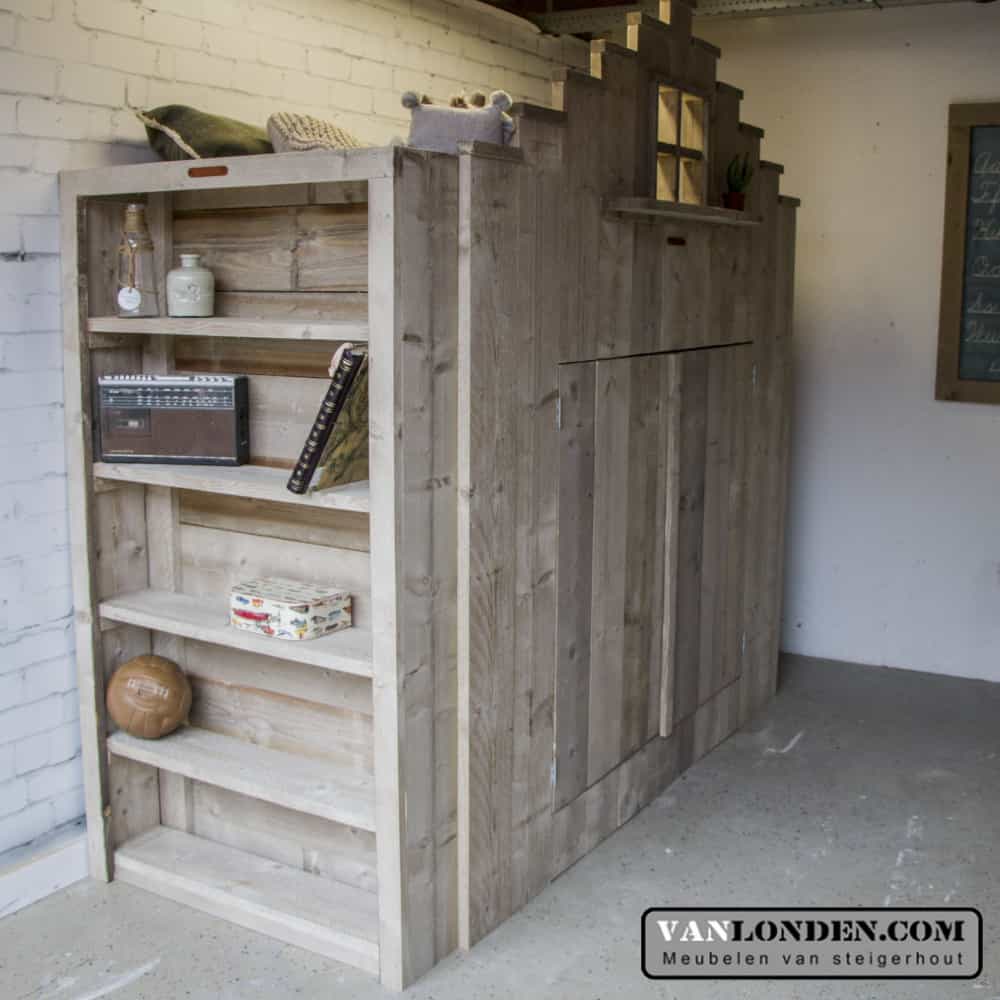 Ben je op zoek naar een origineel steigerhouten bedhuisje en/of bedstee? Bekijk dan eens dit steigerhouten gevel bed met mooie details. Stoer en knus slapen in je eigen huisje bovenin of lekker in de bedstee beneden. Aan de zijkant een handige opbergkast en aan de andere kant natuurlijk de trap om boven te komen.