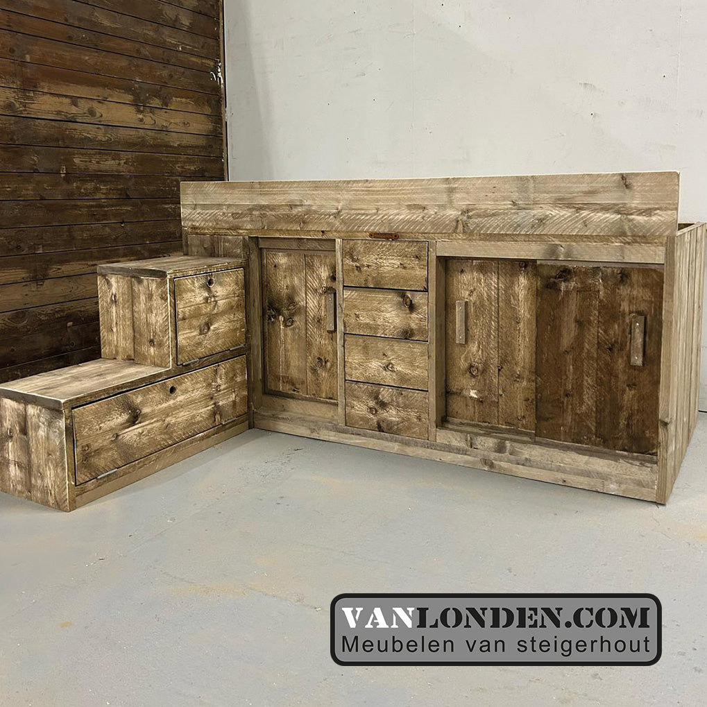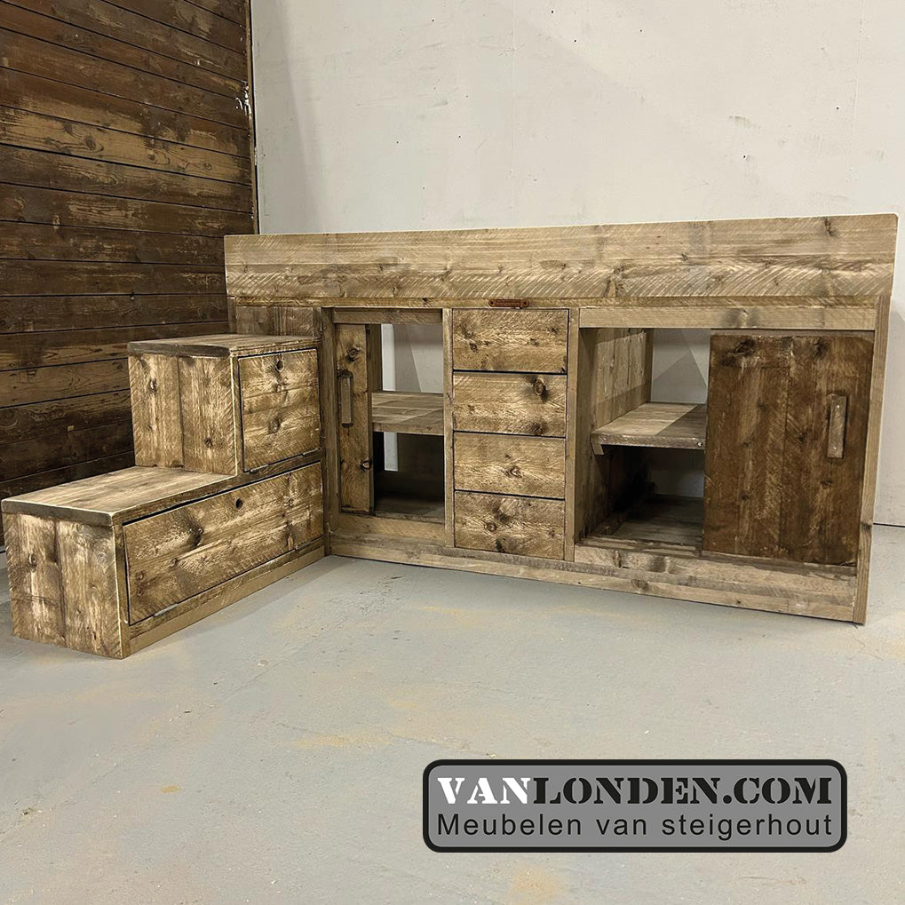 Half-hoogslaper van steigerhout met ingebouwde uitschuifbare kast en trap met een extra opbergruimte