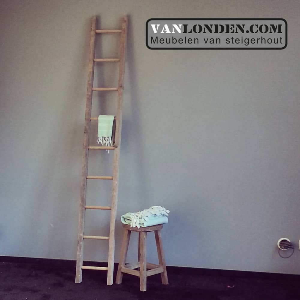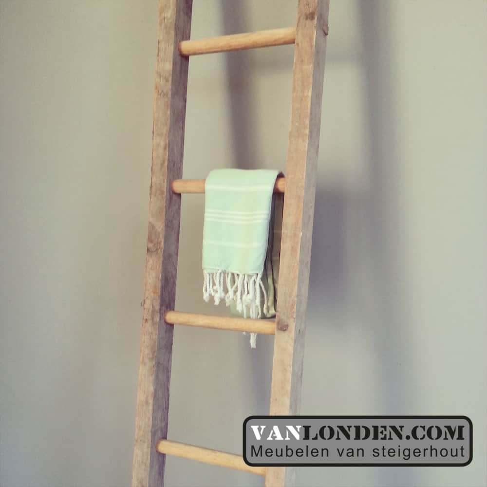 Decoratief steigerhouten handdoek trapje. Een ladder met stoere uitstraling om in de badkamer je handdoeken op te hangen of in de slaapkamer kleren, riemen en kettingen overheen te leggen.