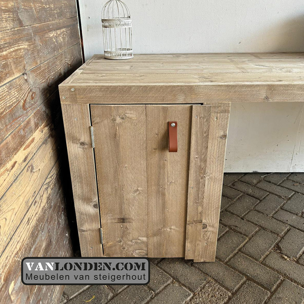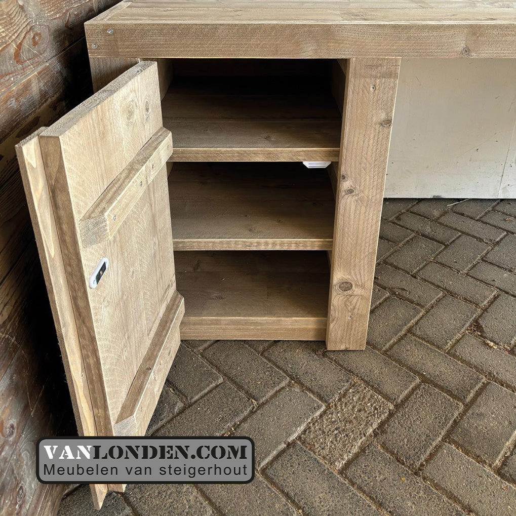 Uniek steigerhouten hoekbureau met kastje met deur voor opbergen van je spullen, maar ook open lades aan de kopse kant voor extra opbergruimte. Dit bureau is ideaal om met tweeën samen te kunnen werken in één ruimte.