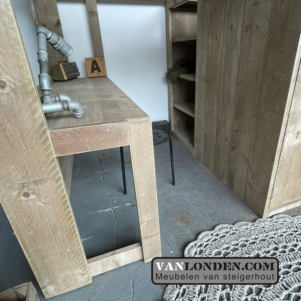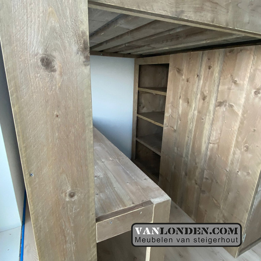 Steigerhouten hoogslaper van steigerhout met ingebouwde kast, trapkast en bureau