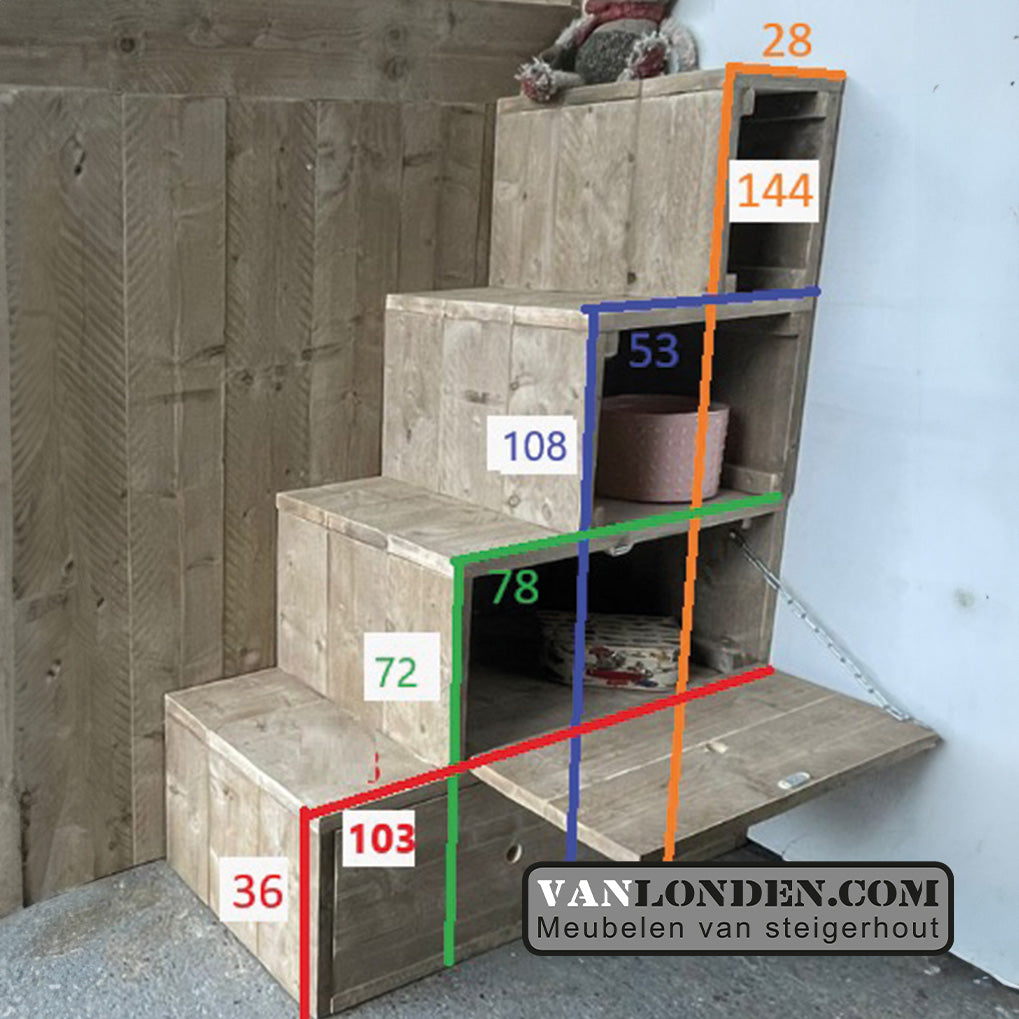 De kast heeft hang- en legruimte en openslaande deuren, of naar wens: schuifdeuren. De kastruimte in de trap is een mooie plek om boeken of je schoenen in op te ruimen.