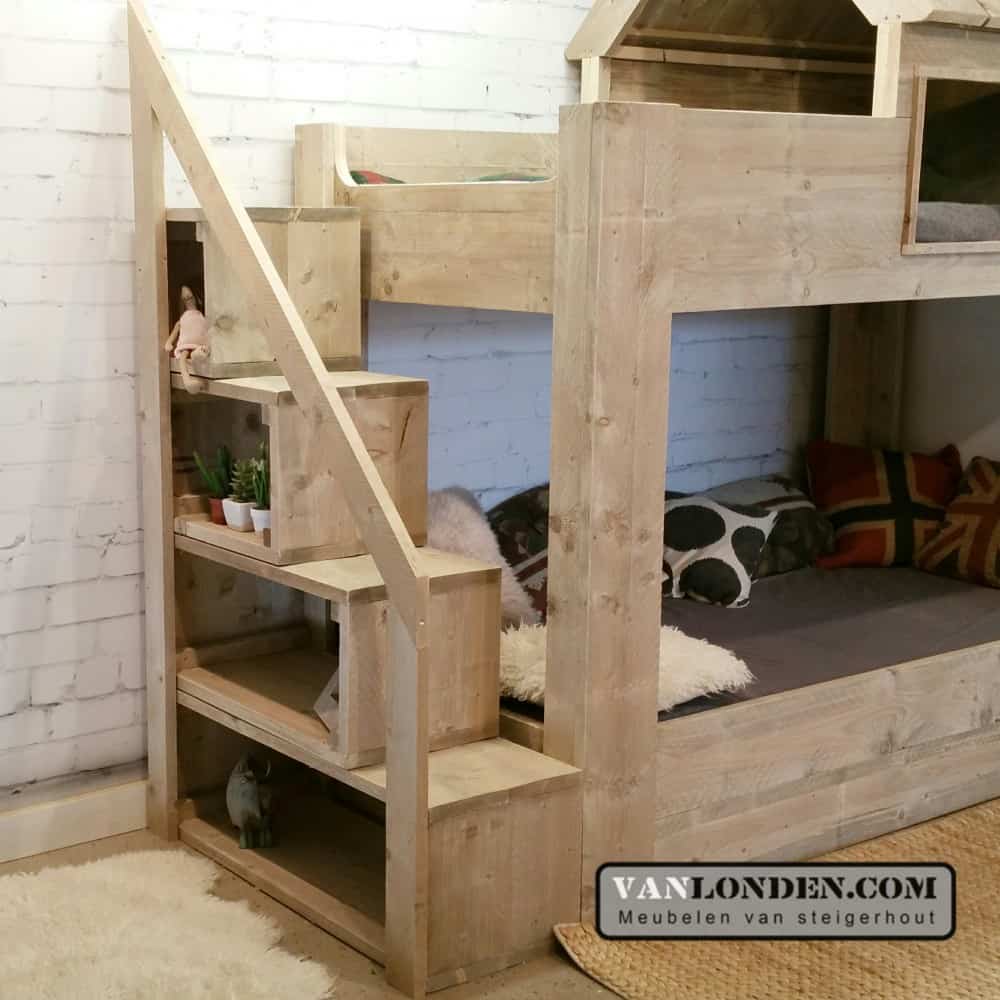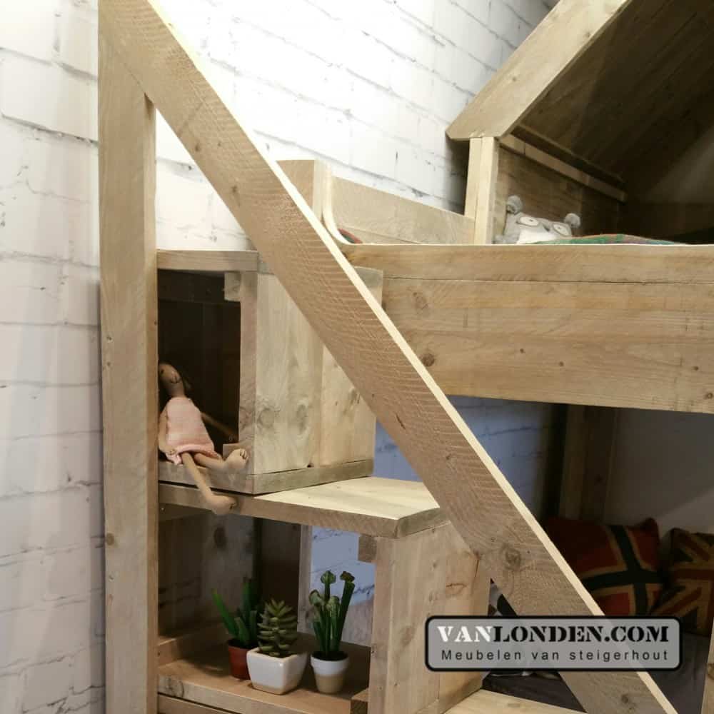 Deze steigerhouten hoogslaper is een prachtig kinderbed en speelhuisje in één met meteen ook een slaapplek voor logeetjes..