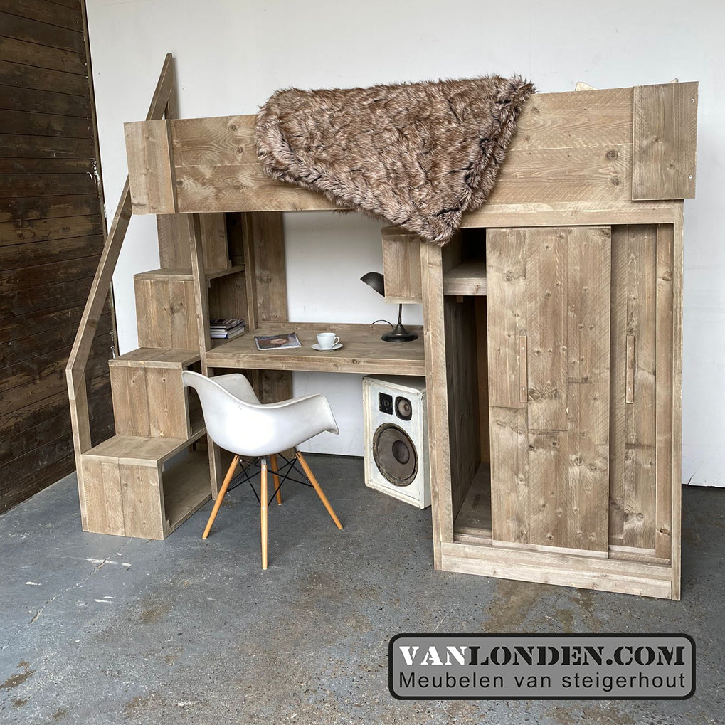Steigerhouten hoogslaper Babs met ingebouwde kast met schuifdeuren en een bureau