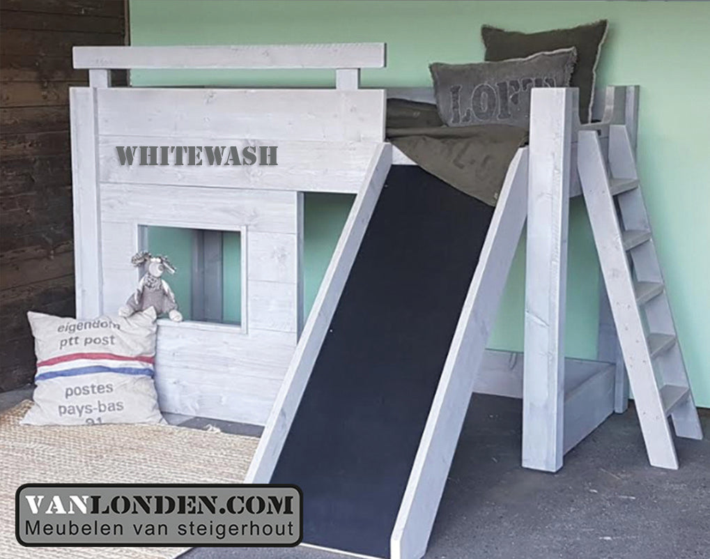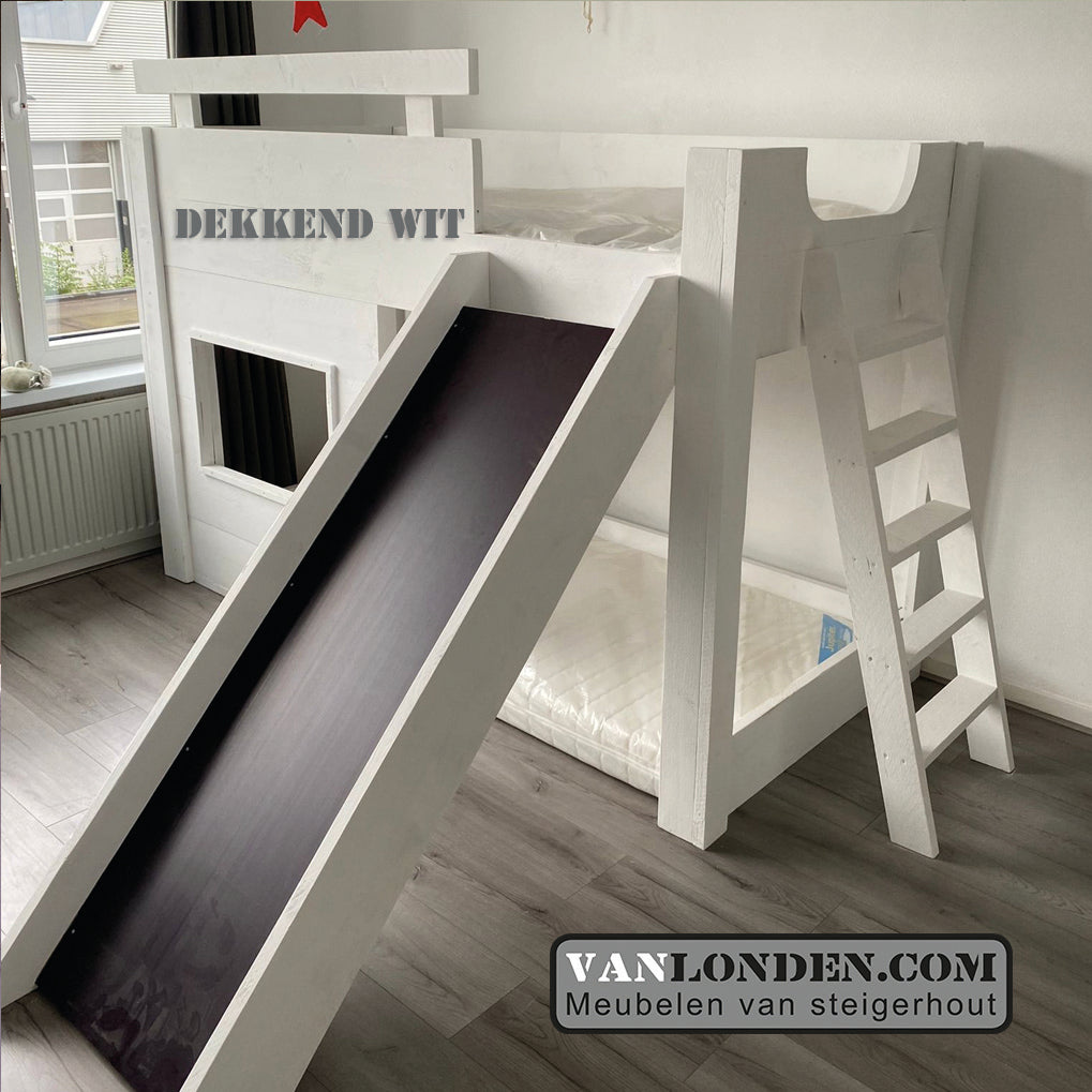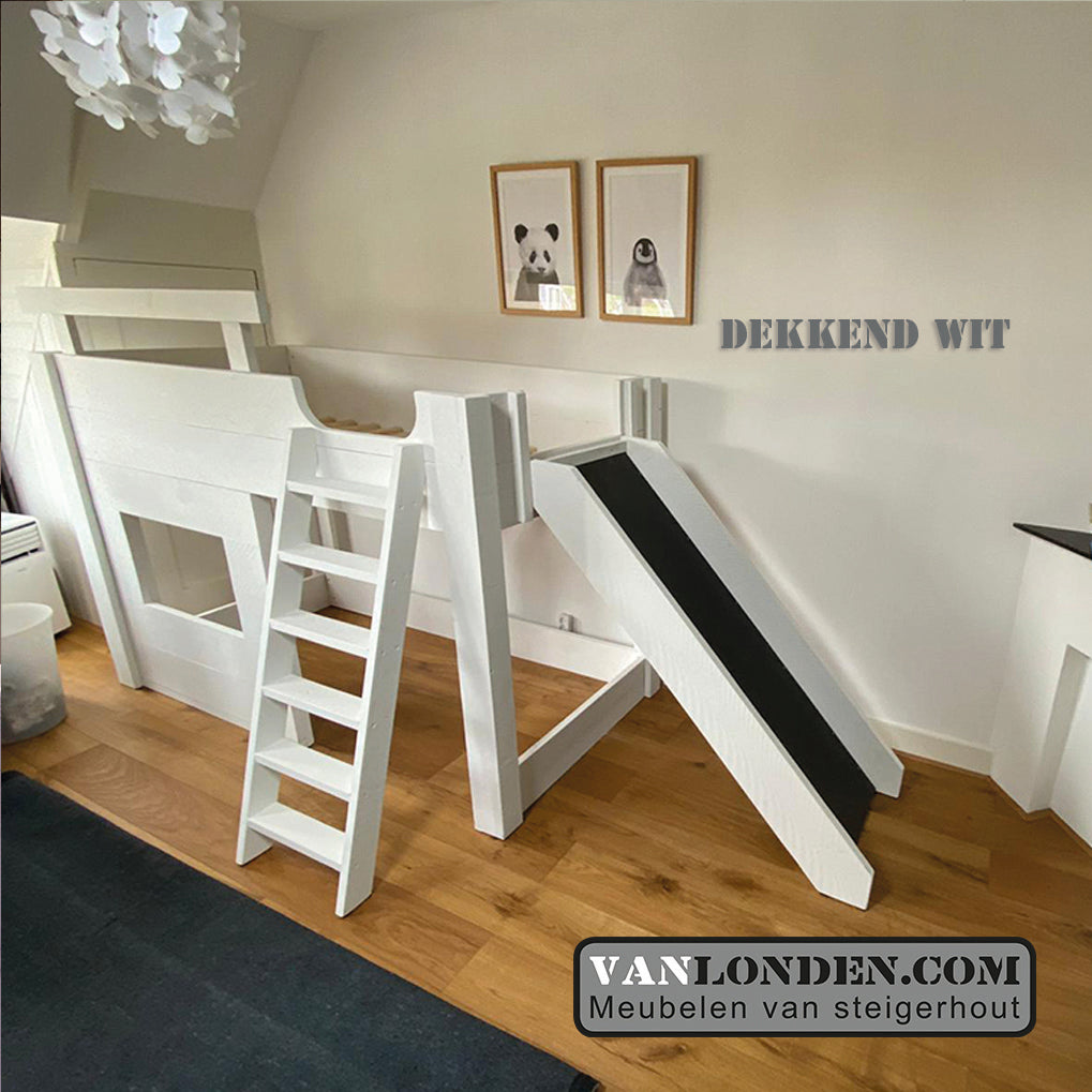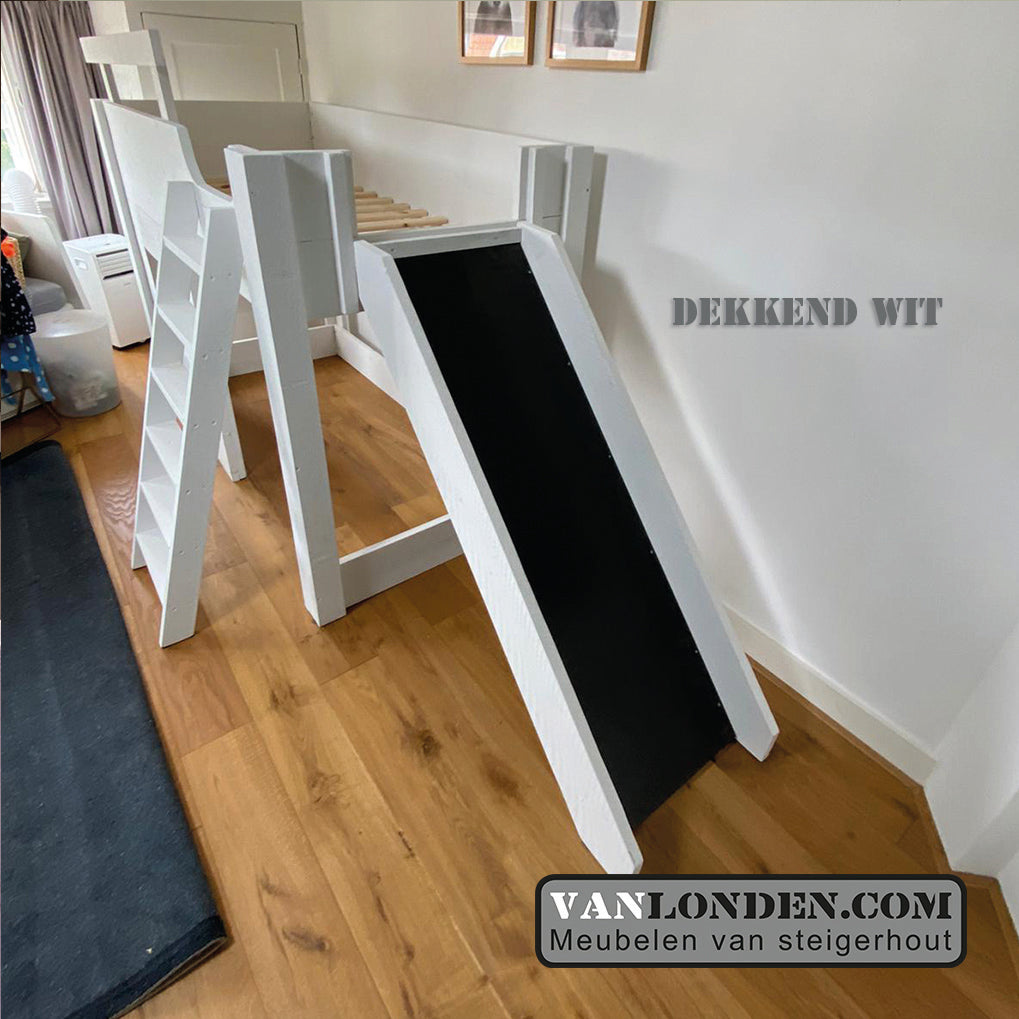 De hoogslaper wordt geleverd inclusief trap. De anti uitval  balk en glijbaan zijn apart bij te bestellen.