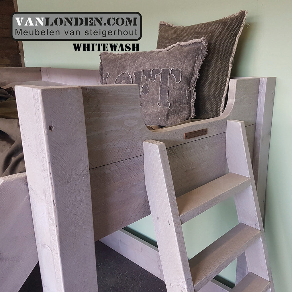 Het bed is in basis in steigerhouten uitvoering, maar kan naar wens gebeitst worden, zoals de whitewash op de foto
