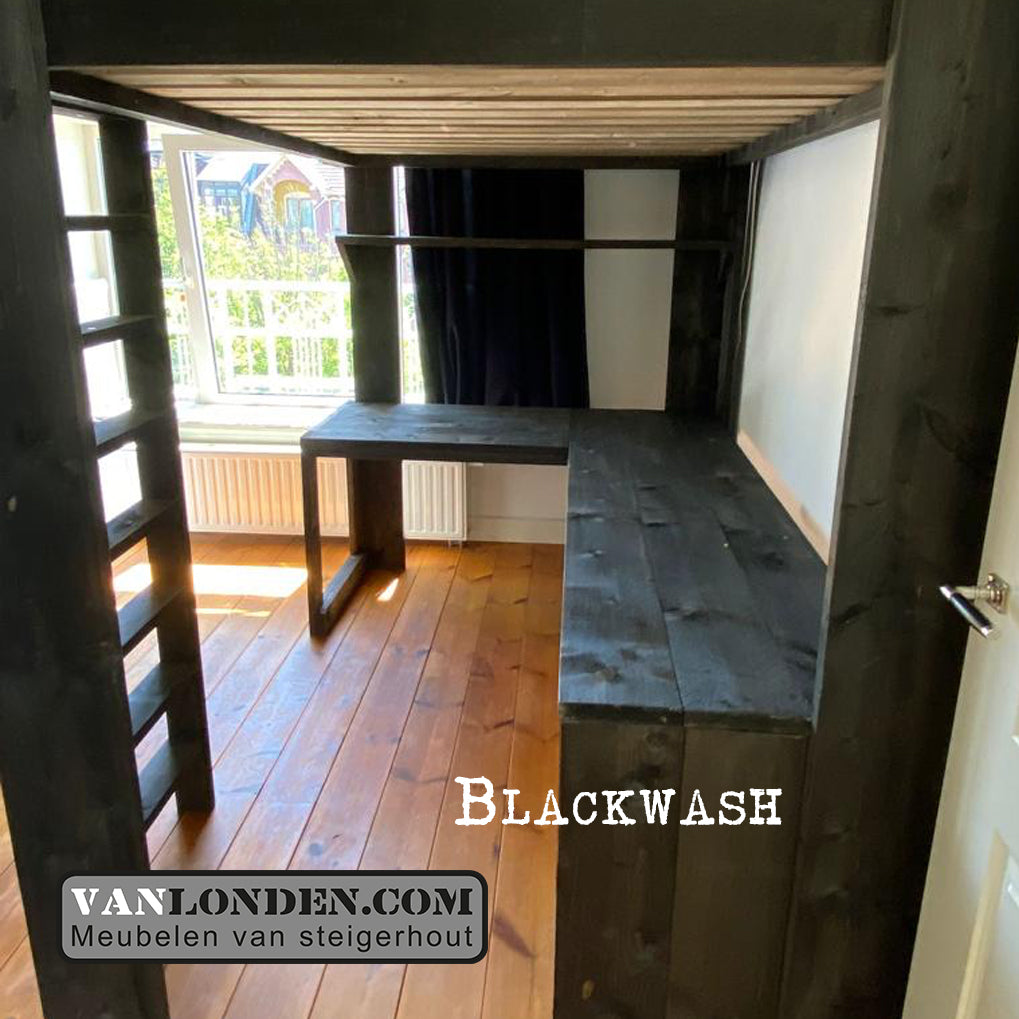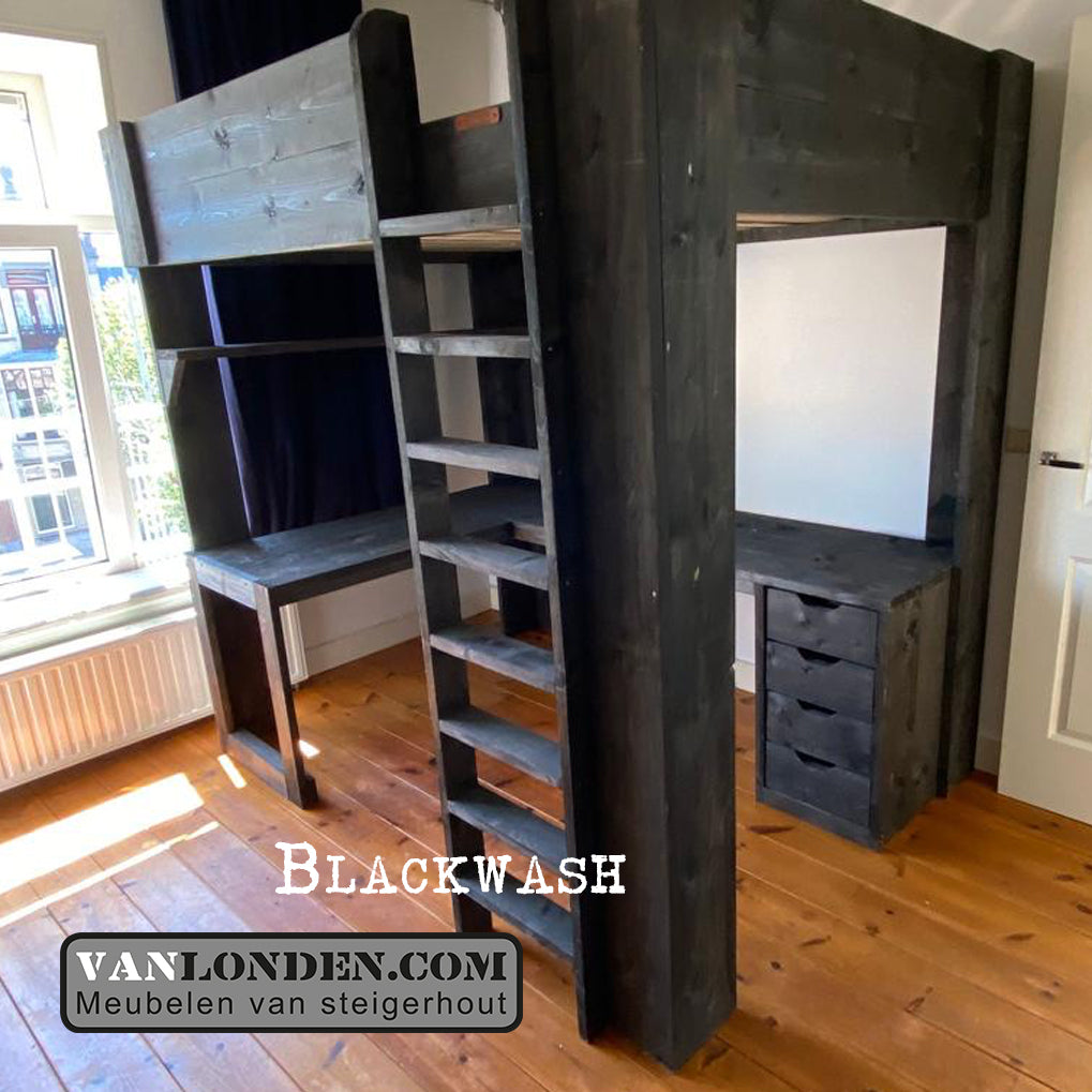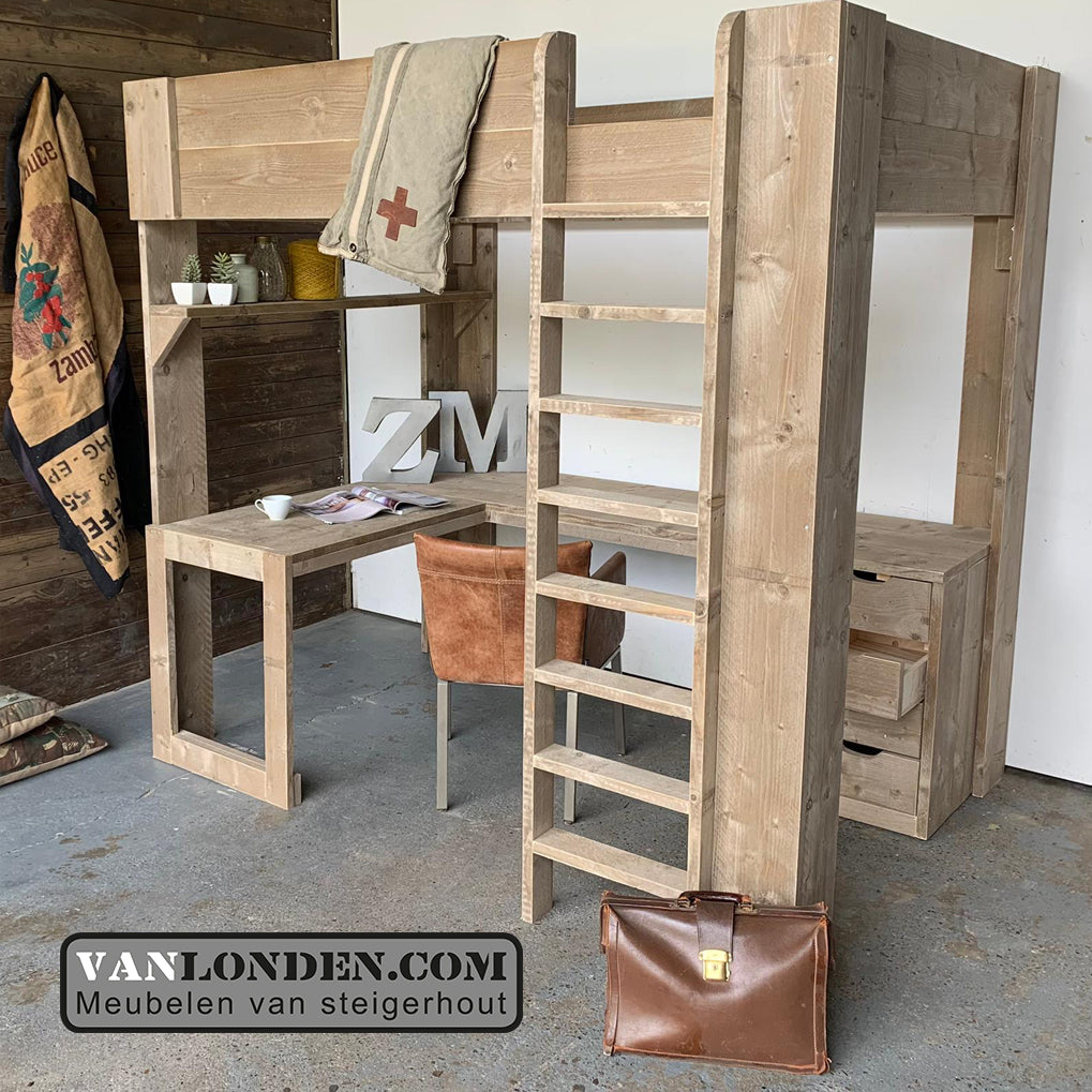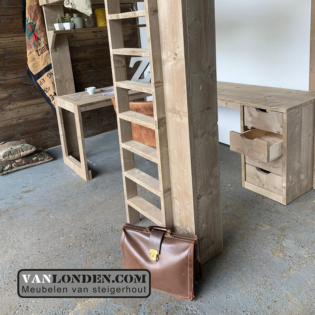 Deze steigerhouten hoogslaper Manu is een mooie oplossing voor slaapkamers met beperkte ruimte. De hoogslaper heeft onder het bed een ruime werk- en studeerplek. Naast het ruime hoekbureau zit een stevige trap naar de hoogslaper en aan de zijkant van het bed aan het bureau zit een praktische opbergruimte.