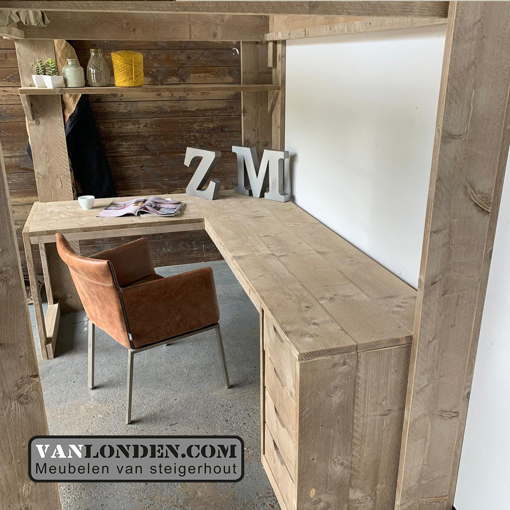 Steigerhouten hoogslaper met hoekbureau Manu