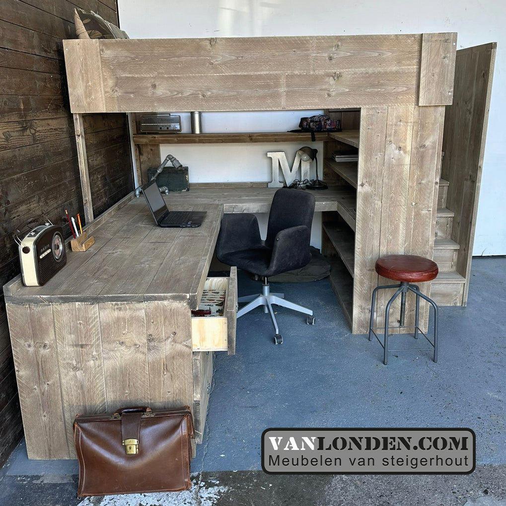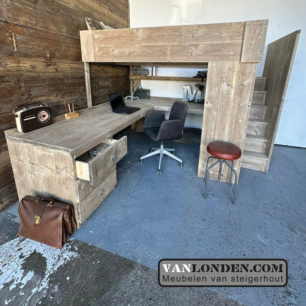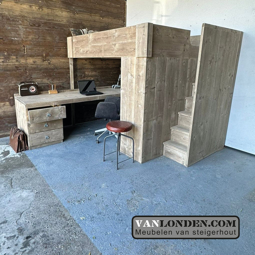 Deze steigerhouten hoogslaper Milan is dé oplossing voor slaapkamers met beperkte ruimte, ideaal ook voor studentenkamers. De hoogslaper heeft niet alleen een comfortabel bed op hoogte, maar ook een praktisch geïntegreerd bureau en kastje met lades eronder. Onder het bed bevinden zich handige legplanken, perfect voor het opbergen van boeken, kleding of decoratieve items. Het meubel is gemaakt van duurzaam steigerhout, voor een natuurlijke en moderne uitstraling. Het bed is voorzien van een veilige en stevige trap, waardoor gemakkelijk toegang tot het bed mogelijk is.