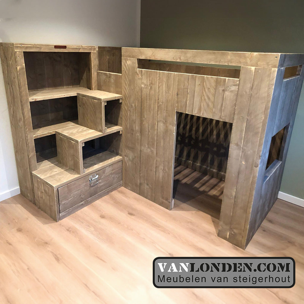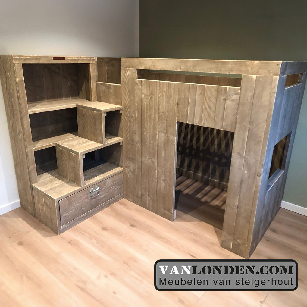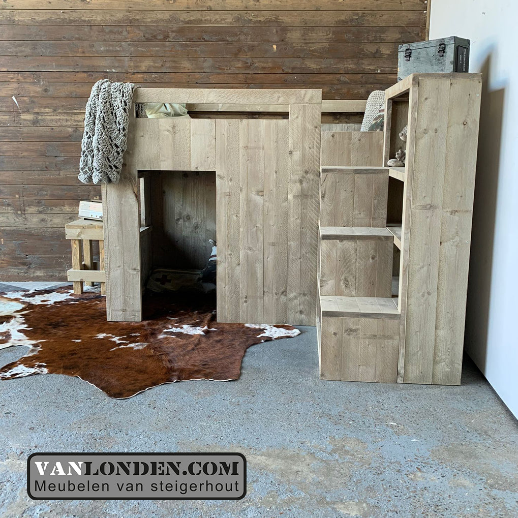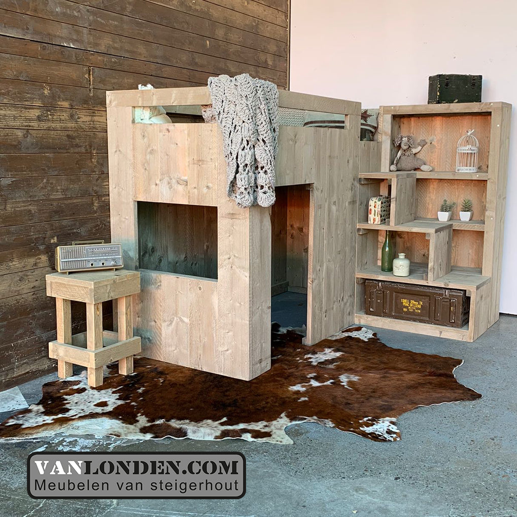 Deze steigerhouten hoogslaper Josje is dé sfeervolle oplossing voor kleine slaapkamers. De hoogslaper heeft onder het bed een leuke speelruimte. Heel veel opbergruimte in de kast en trap voor speelgoed, boeken en allerhande spullen. De bijpassende mooie stoere kist is ook te bestellen om de stoere look helemaal compleet te maken.