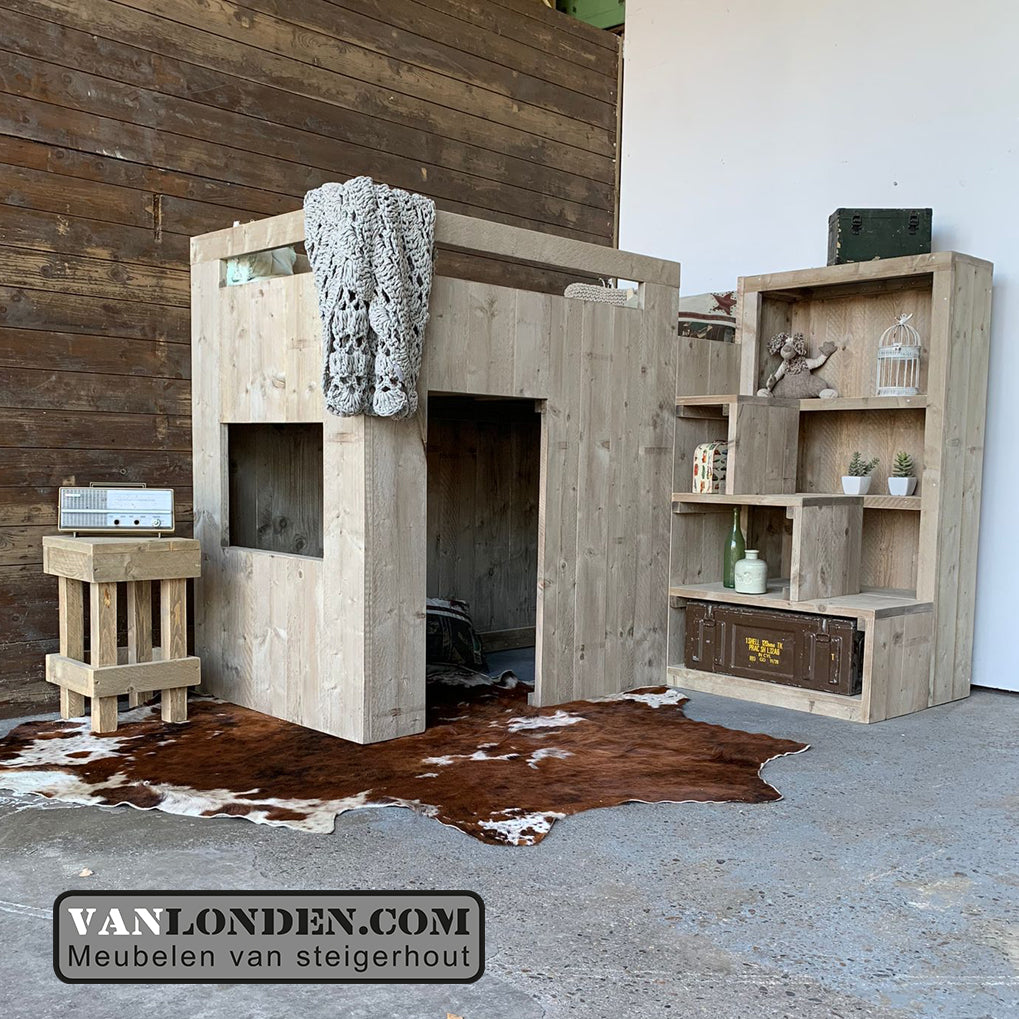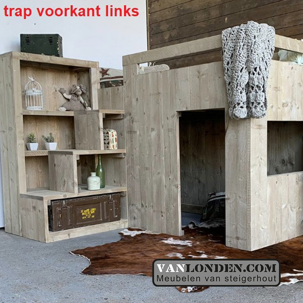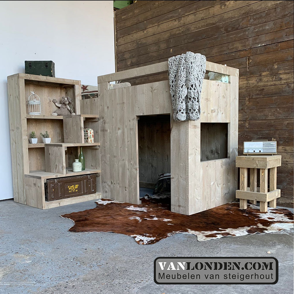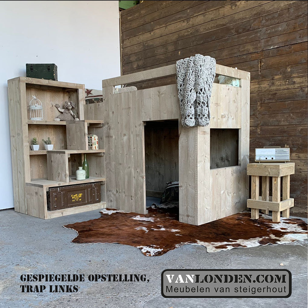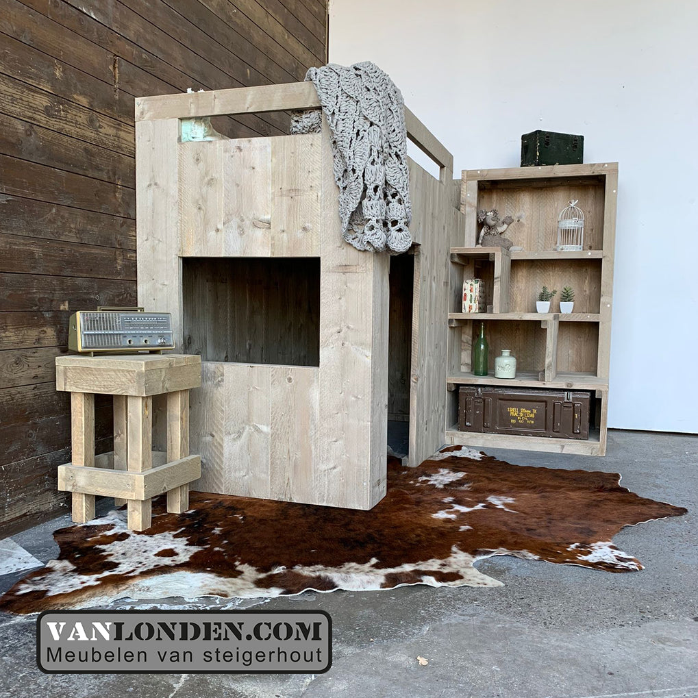 Deze steigerhouten hoogslaper Josje is dé sfeervolle oplossing voor kleine slaapkamers. De hoogslaper heeft onder het bed een leuke speelruimte. Heel veel opbergruimte in de kast en trap voor speelgoed, boeken en allerhande spullen. De bijpassende mooie stoere kist is ook te bestellen om de stoere look helemaal compleet te maken.