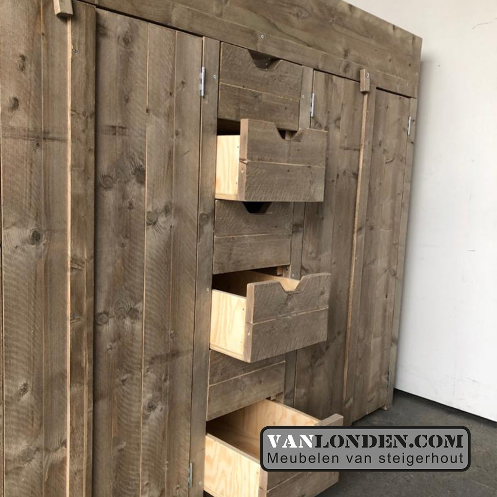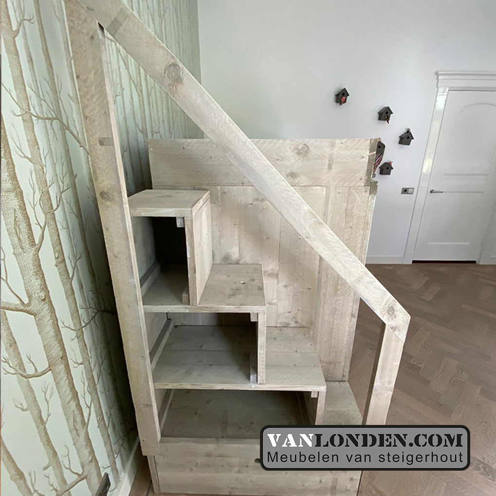Deze hoogslaper van steigerhout Karel is een enorme ruimte bespaarder in kleine slaapkamers. Het is een combinatie van een hoogslaper, 2 kledingkasten, lades en een trapkast met extra opbergruimte! In de trapkast passen je boeken of speelgoed en er is een mogelijkheid om onderin nog een extra opberglade te bestellen, zoals op de foto.
