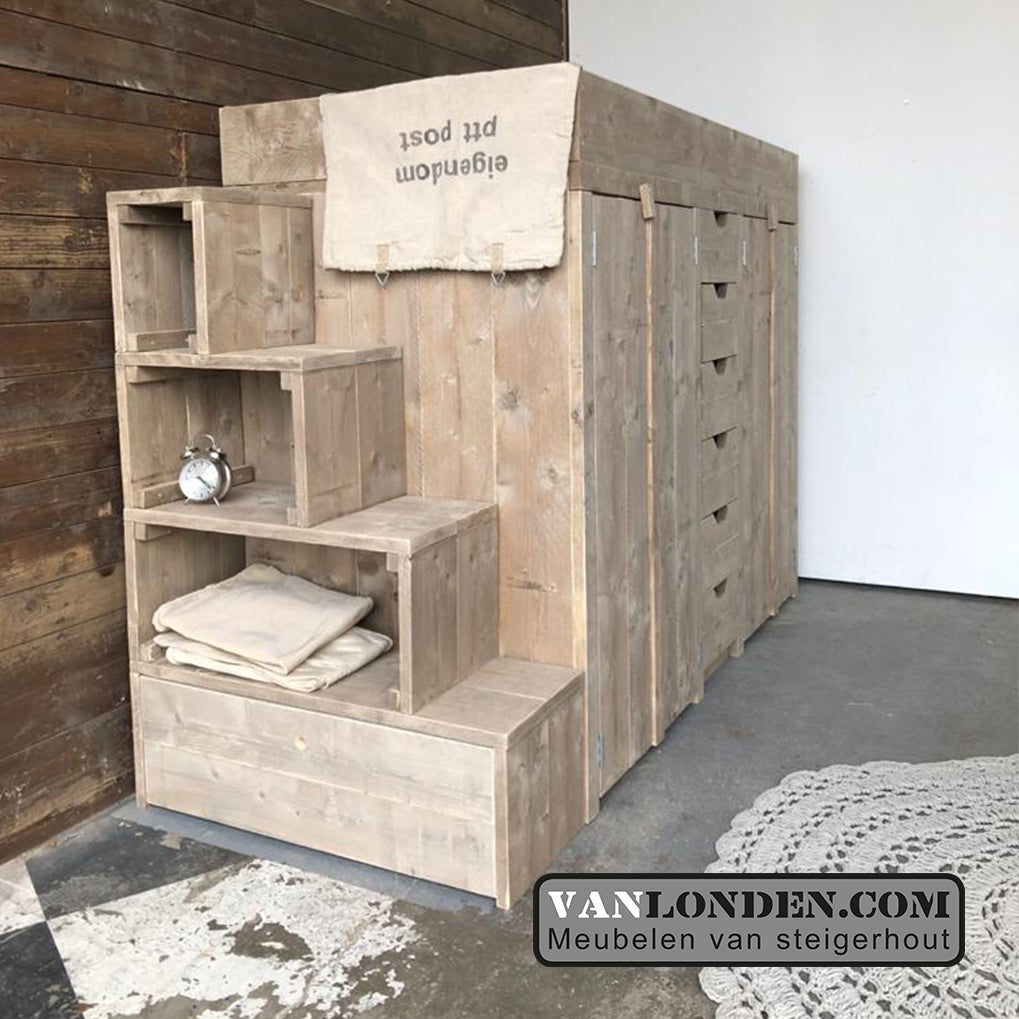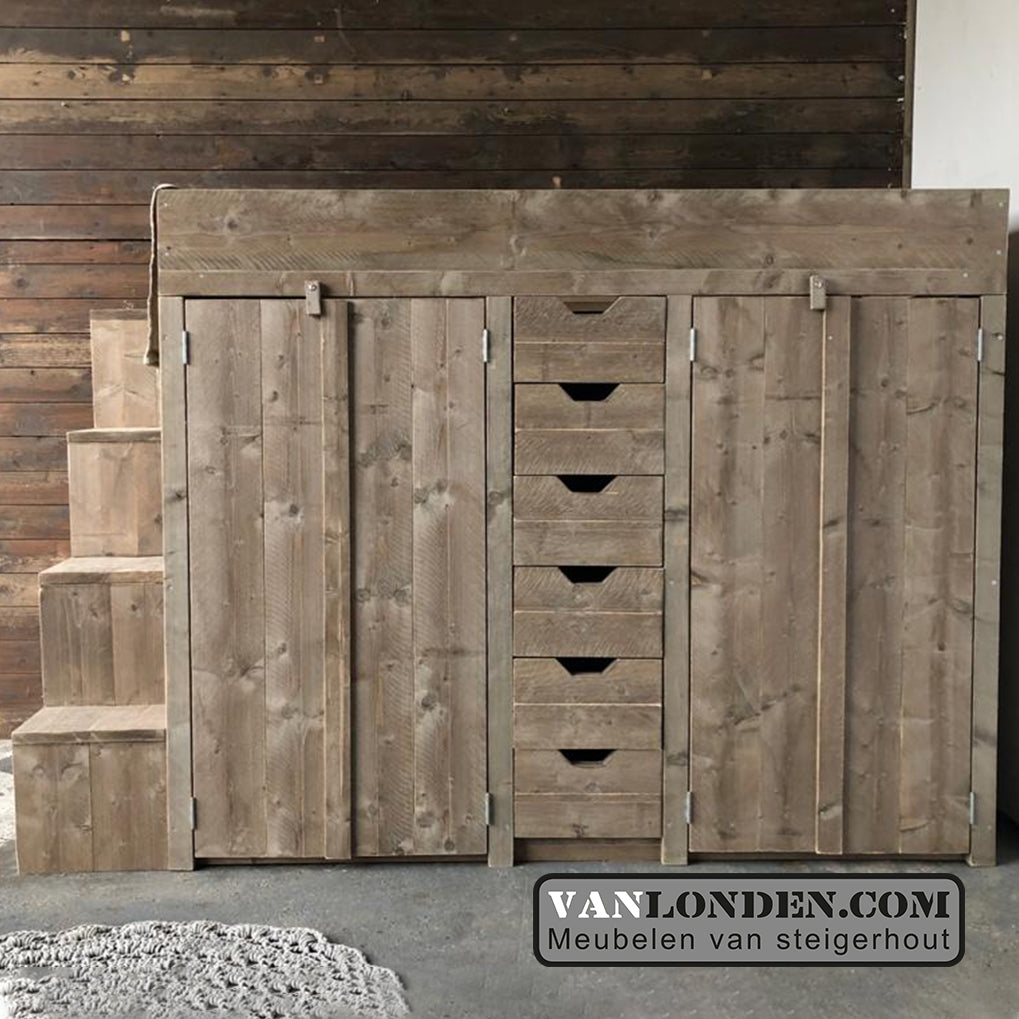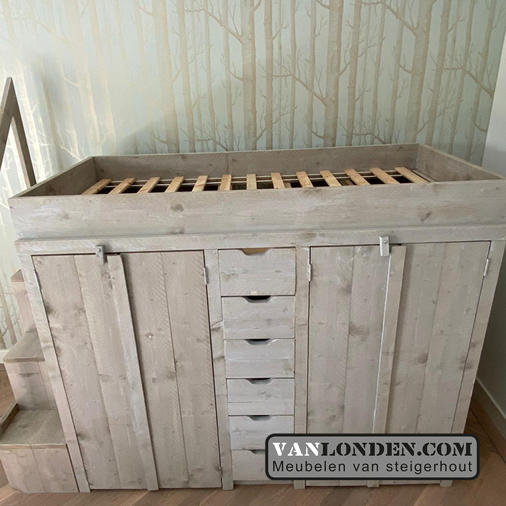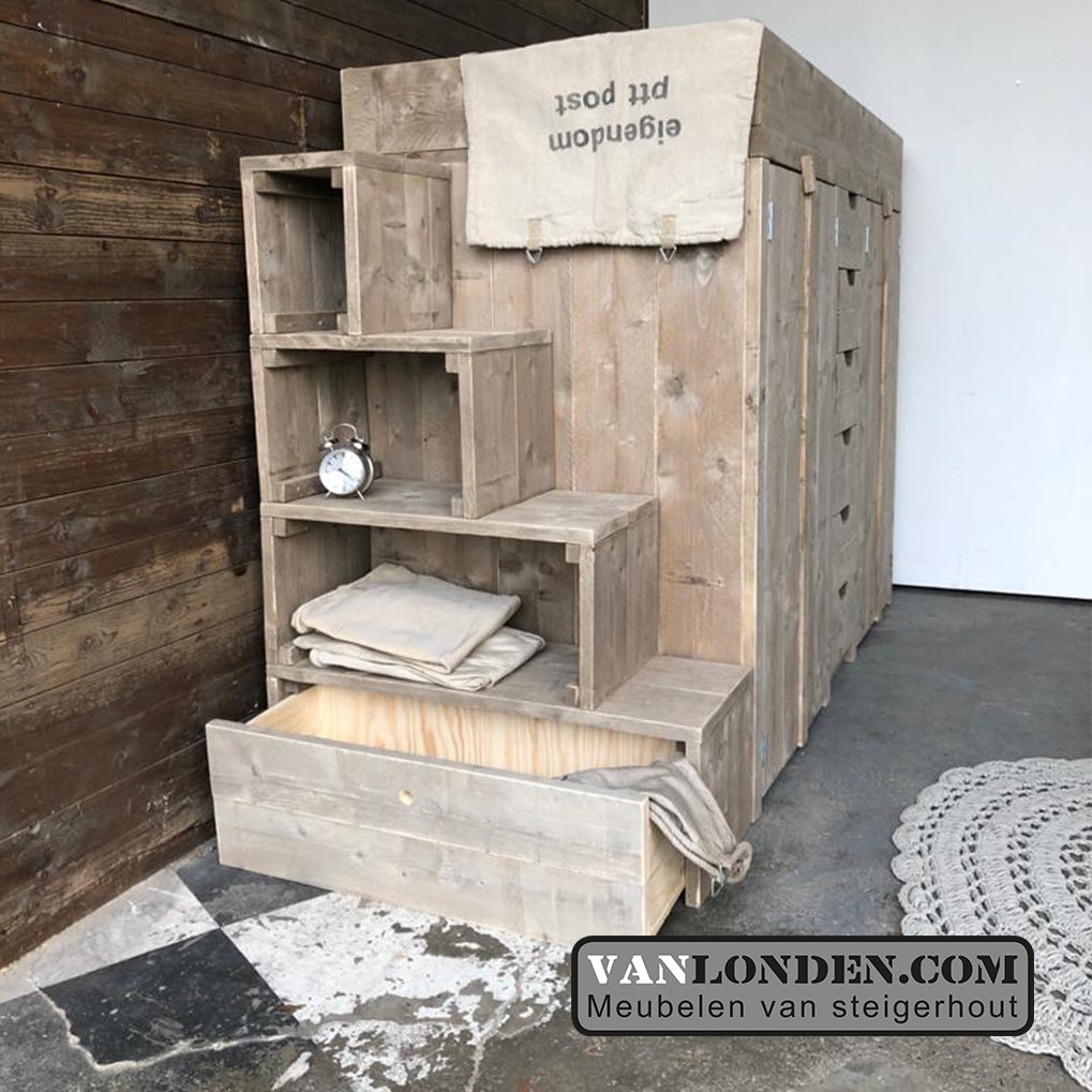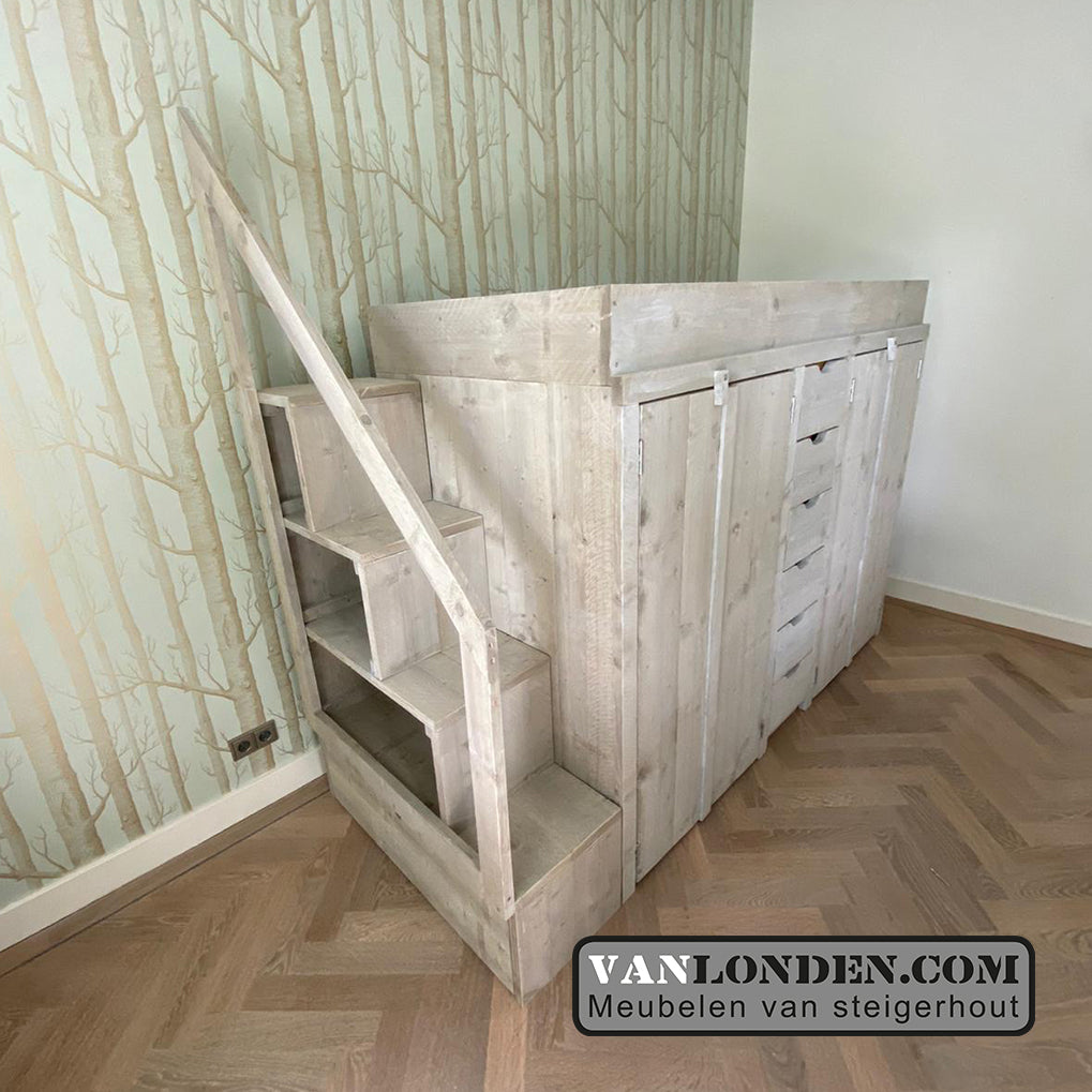 Steigerhouten hoogslaper met ingebouwde kasten, lades en trapkast