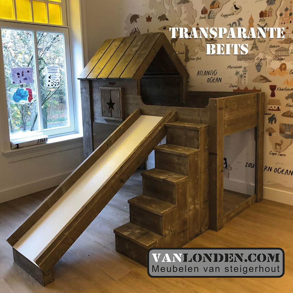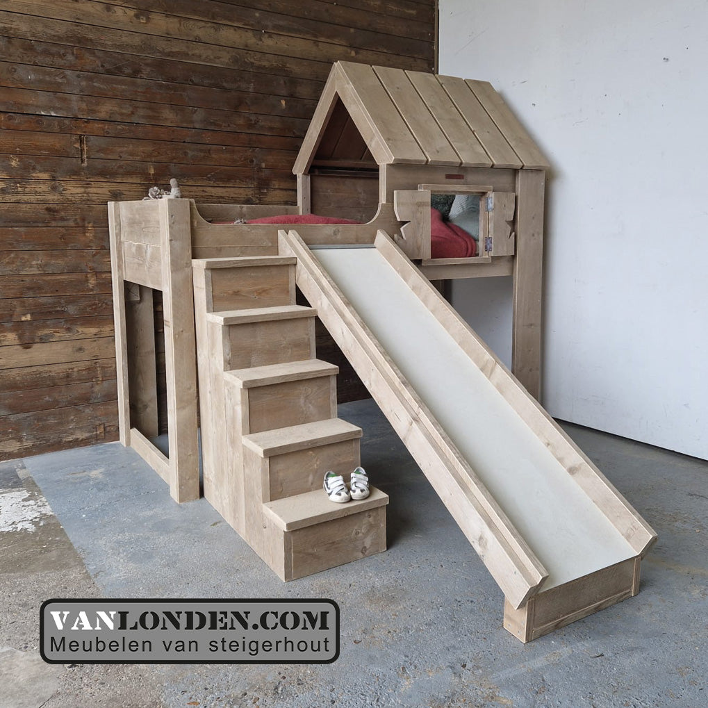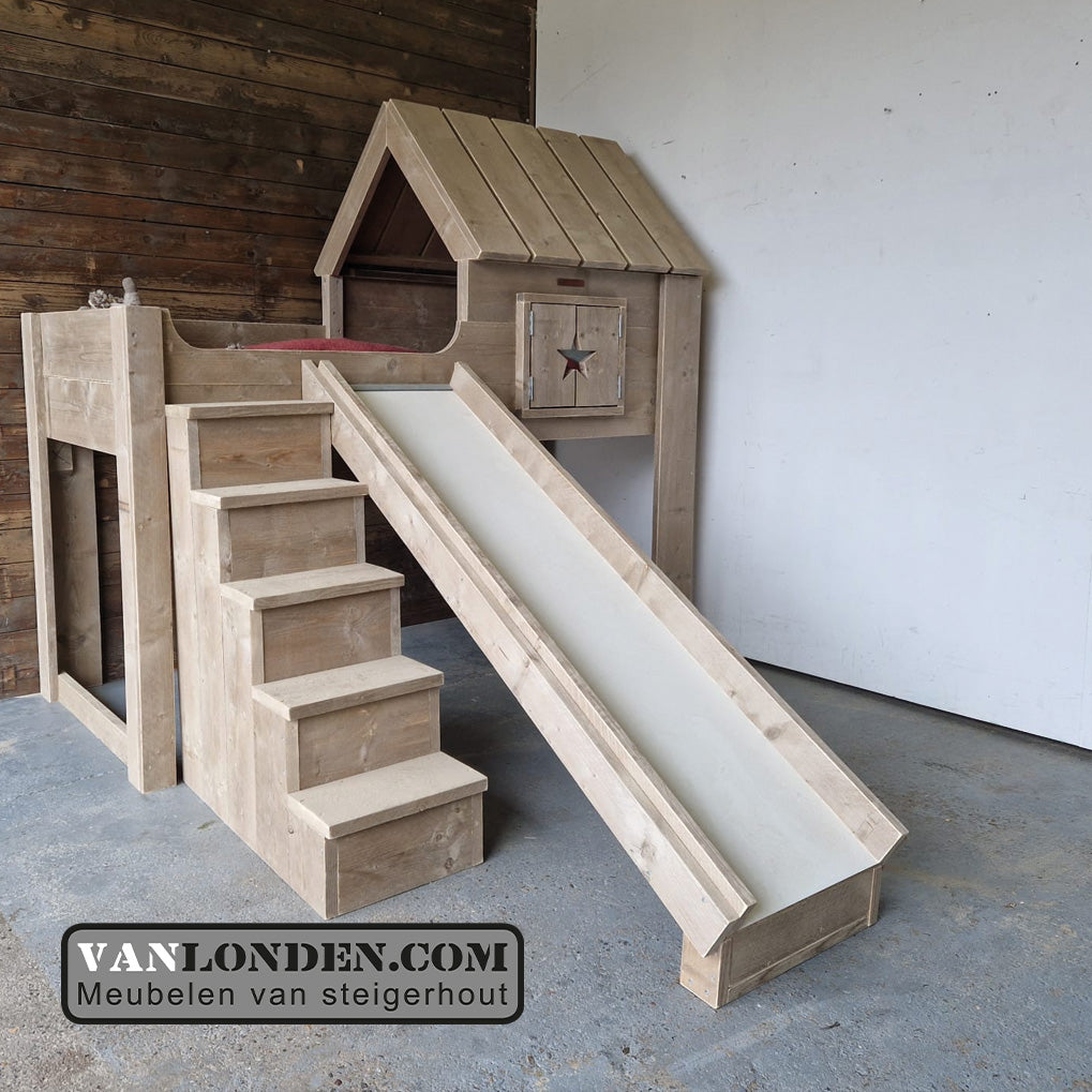 Wat is er nu leuker dan slapen en spelen tegelijk in dit bed met glijbaan! Een stoer bed met opbergruimte voor al je knuffels, boekjes en speelgoed en een mooie verstop plek onder je bed. Lekker klimmen en klauteren via de trap en met en dan natuurlijk supersnel glijden naar beneden. Deze glijbaan is optioneel en heeft een meerprijs van €249,95