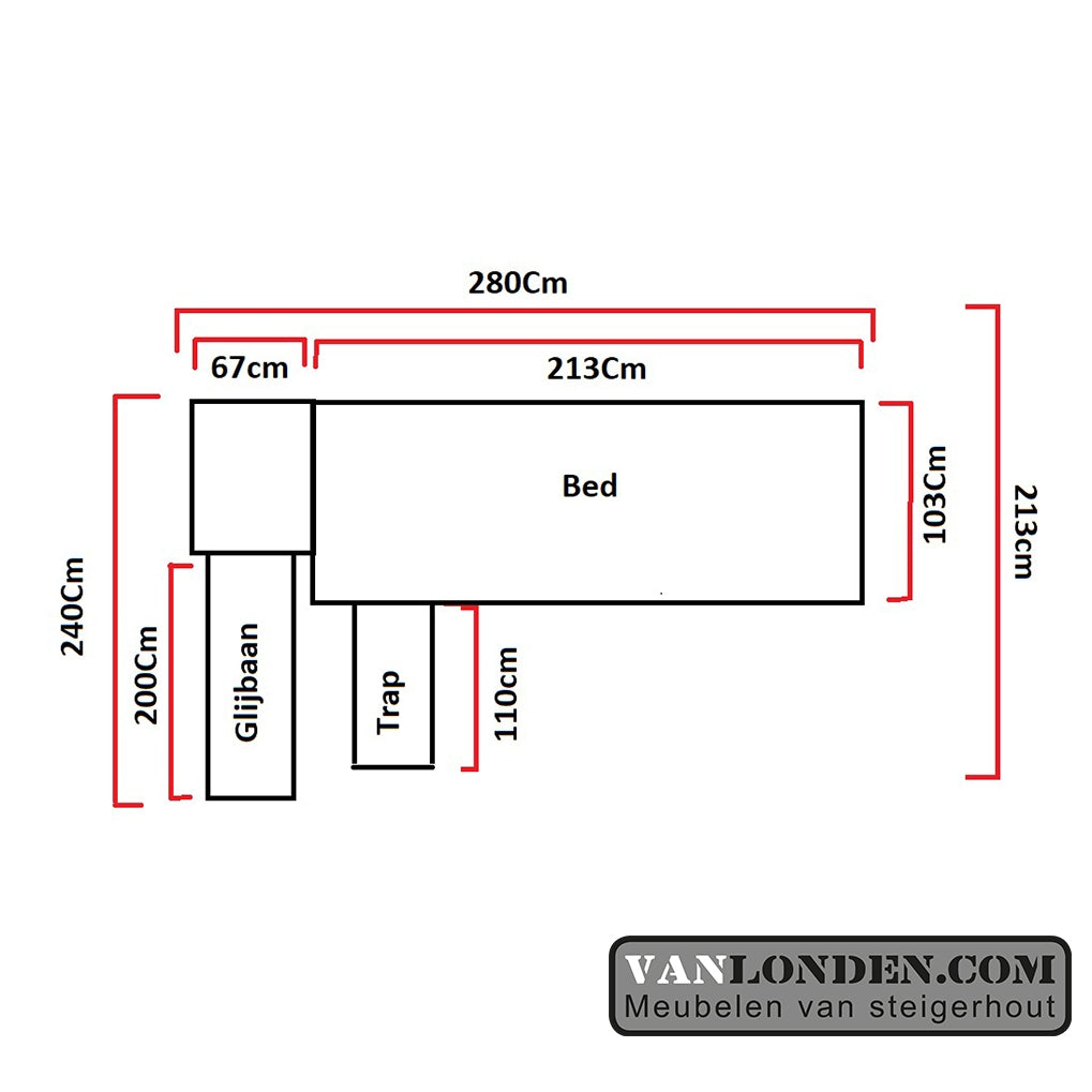 Hoe spannend en leuk is dat, slapen in je eigen huisje en met de glijbaan naar beneden! Een stoer bed met een extra slaapplek onder je bed voor gezellige logeerpartijtjes. Lekker klimmen en klauteren via de trap en met en dan natuurlijk supersnel glijden naar beneden. Deze glijbaan inclusief plateau met hekjes is optioneel en heeft een meerprijs van €225,-, de opberglade kan extra besteld worden voor €99,95