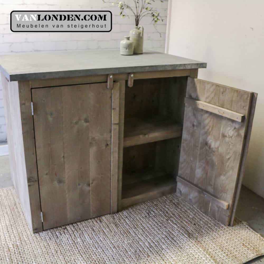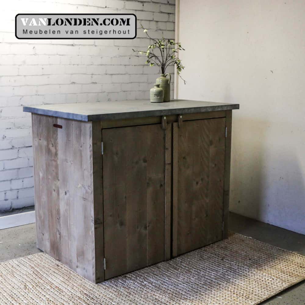 Steigerhouten keukenmeubel met zinken blad. Het zinken blad is verouderd met speciale zuren, waardoor het een hele mooie vintage uitstraling krijgt.