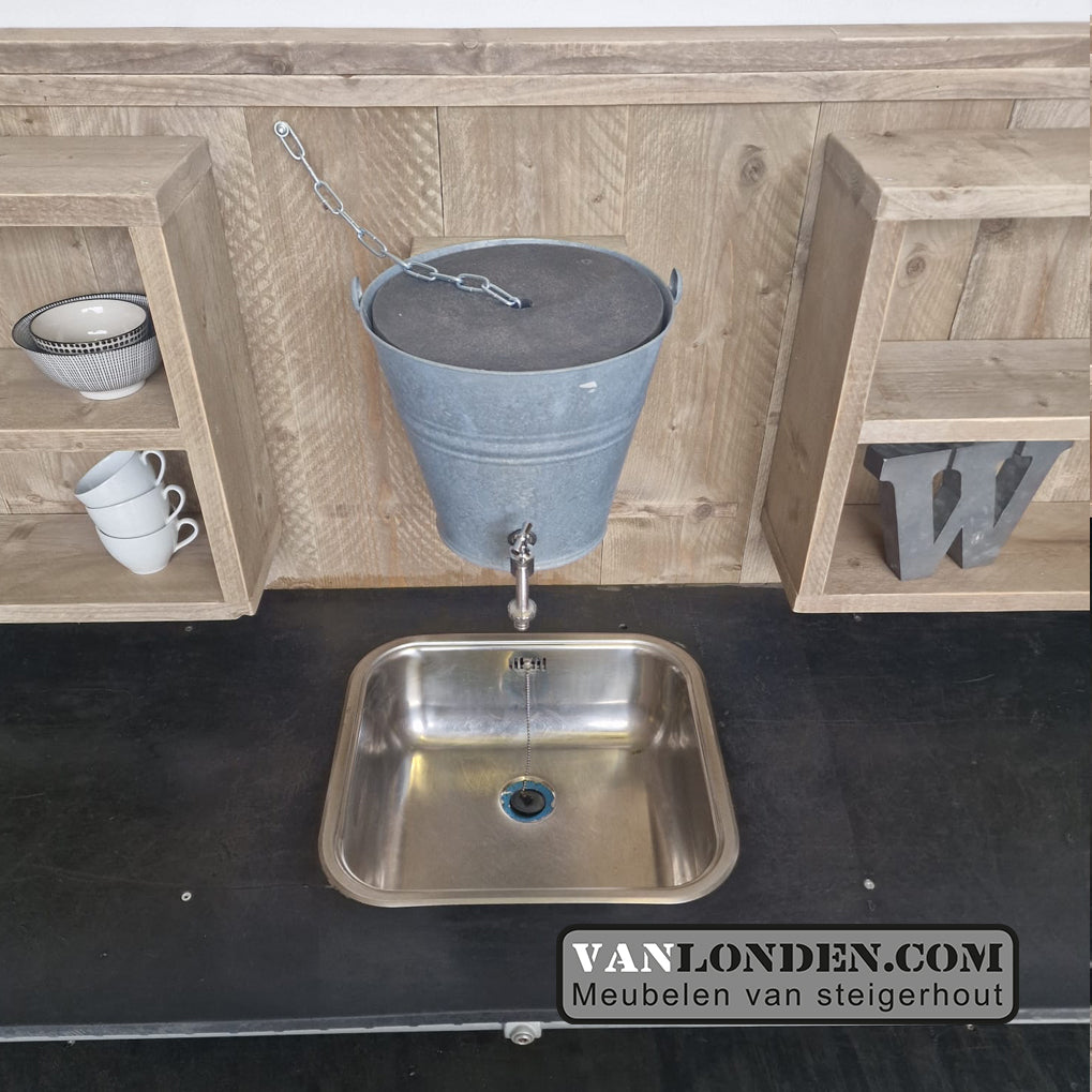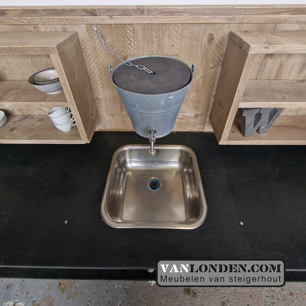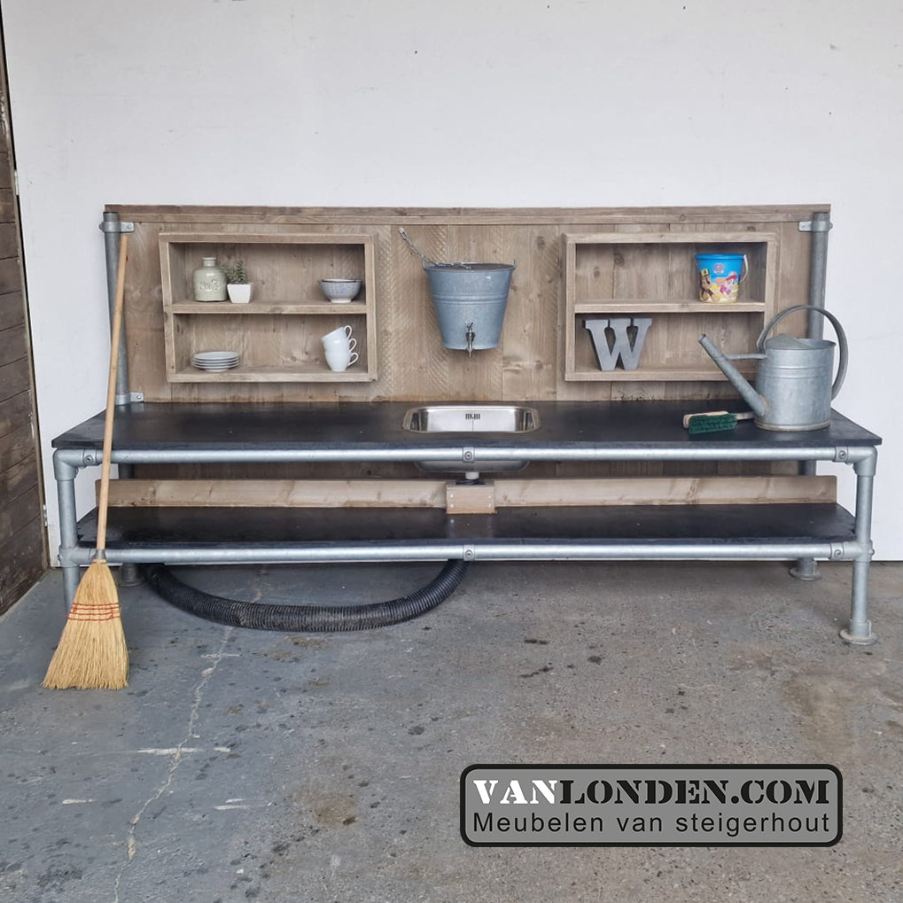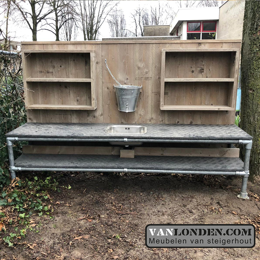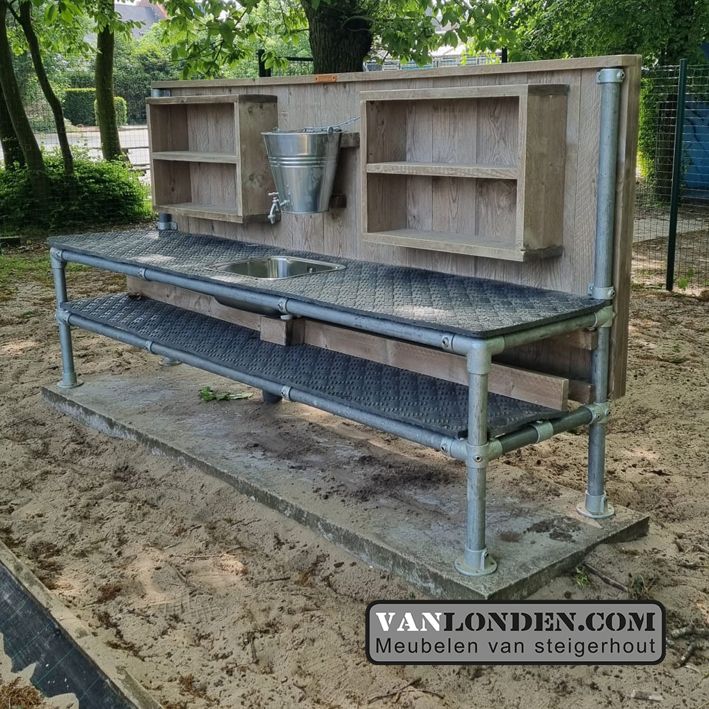Wat een heerlijke speelkeuken voor buiten in de tuin of op schoolpleinen of kinderdagverblijf. Lekker spelen met water, die je vanuit de gevulde emmer kunt tappen met het kraantje. Het blad van kunststof is waterbestendig en de keuken is onverwoestbaar door de stalen buizen. lekker modderen maar!