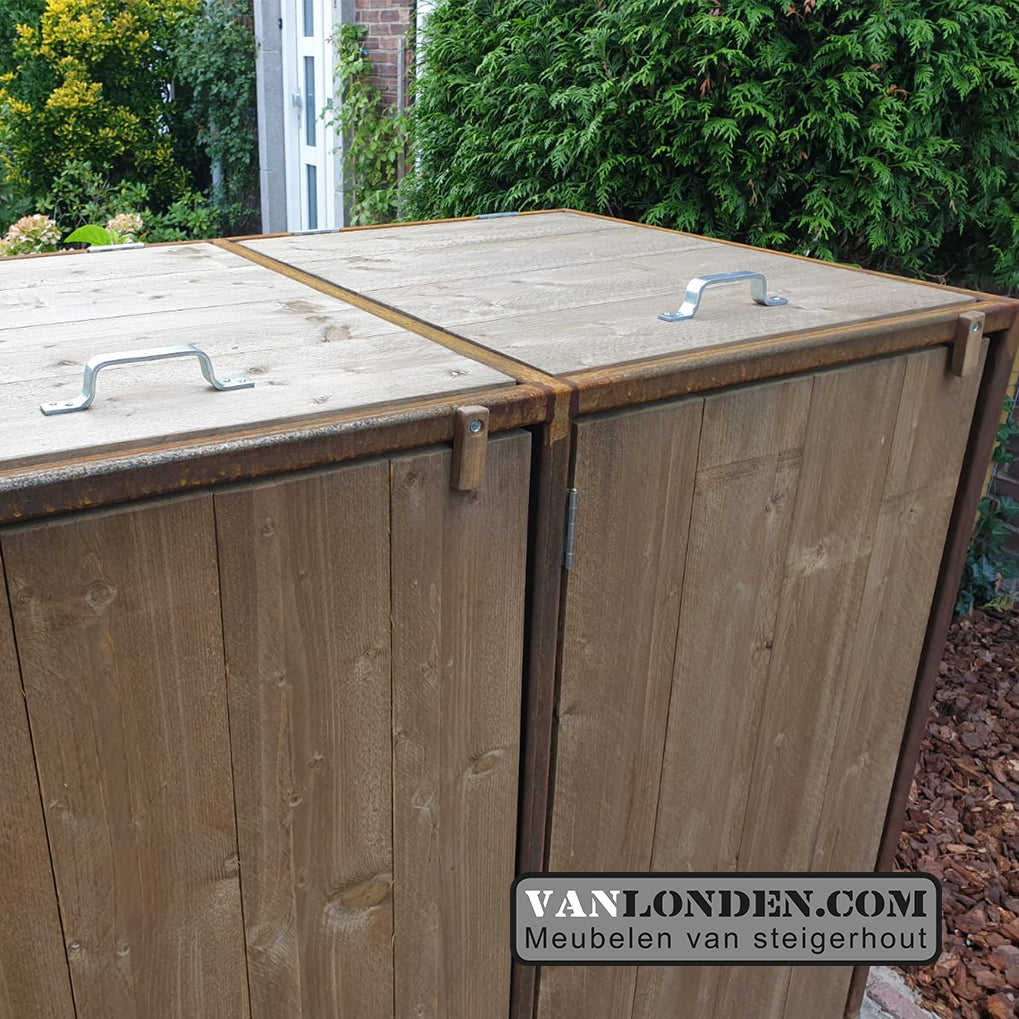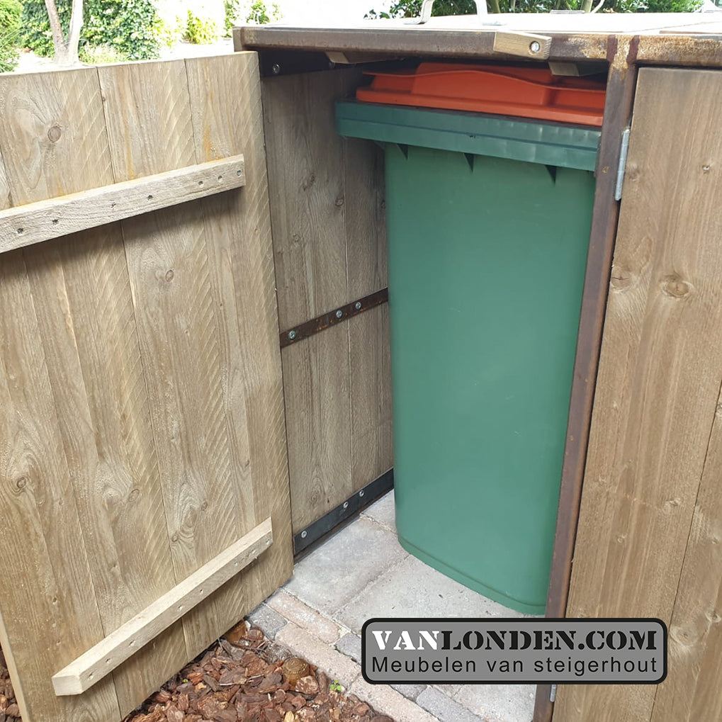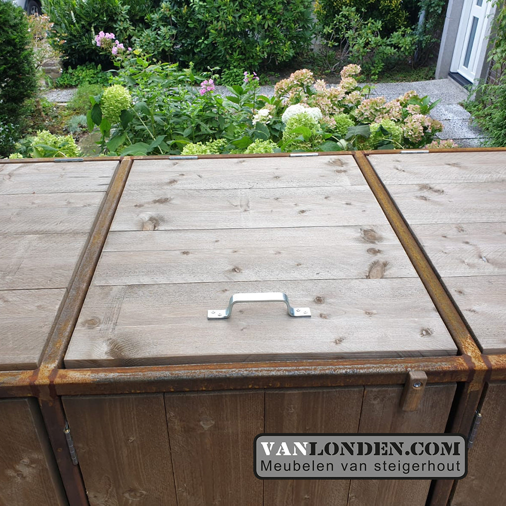 Deze stoere steigerhouten ombouw is geschikt voor 3 Kliko 's en heeft een stalen frame. Hele stabiele ombouw dus en een praktische oplossing voor een opgeruimd terras!